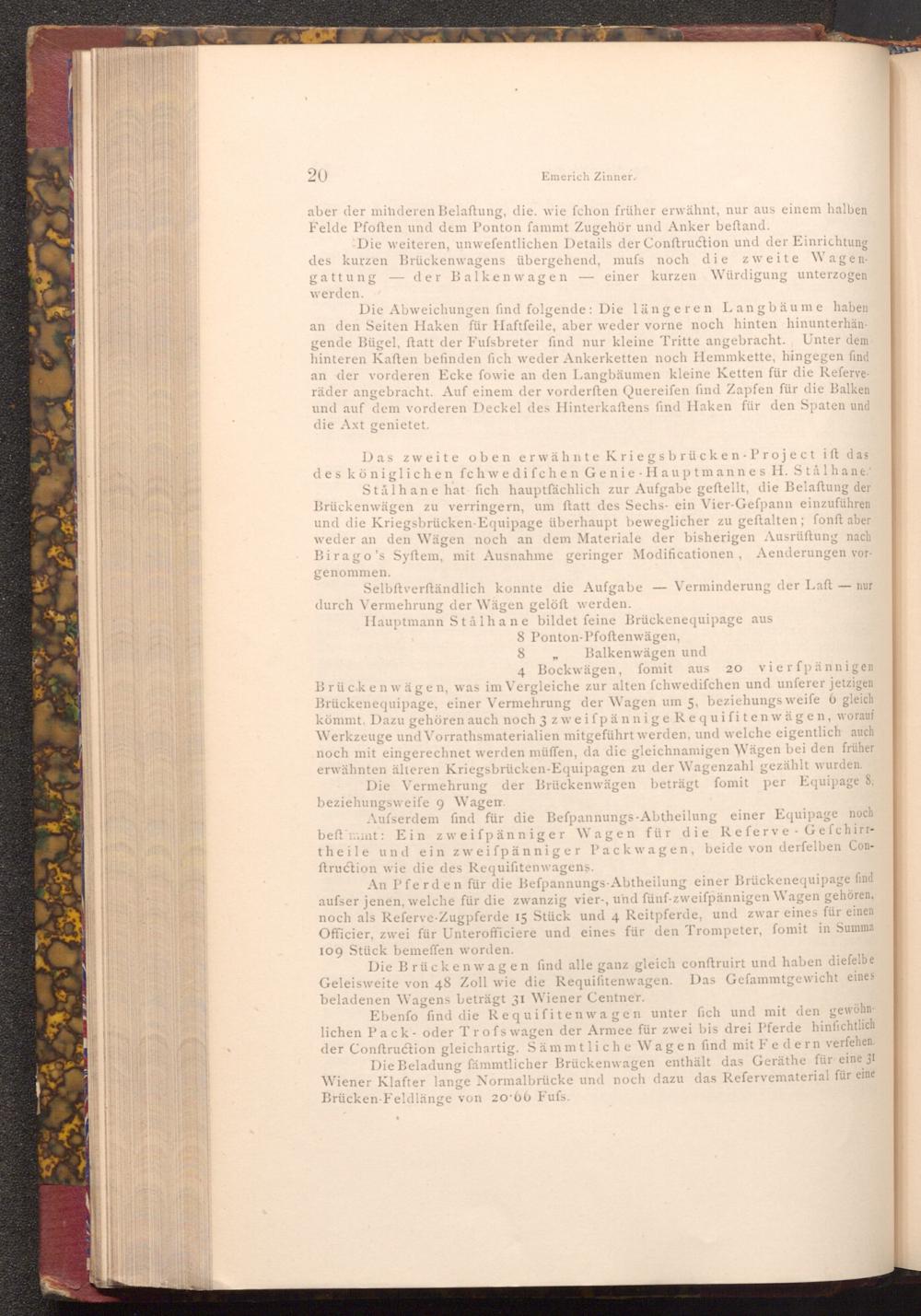 Das zweite oben erwähnte Kriegsbrücken- Project ift das des königlichen fchwedifchen Genie Hauptmannes H. Stålhane. Stålhane hat fich hauptfächlich zur Aufgabe geftellt, die Belaftung der Brückenwägen zu verringern, um ftatt des Sechs- ein Vier- Gefpann einzuführen und die Kriegsbrücken- Equipage überhaupt beweglicher zu geftalten; fonft aber weder an den Wägen noch an dem Materiale der bisherigen Ausrüftung nach Birago's Syftem, mit Ausnahme geringer Modificationen, Aenderungen vor
