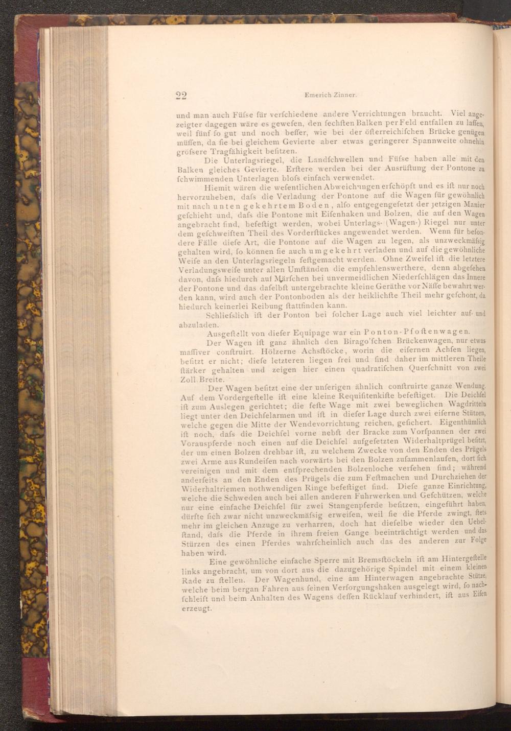Hiemit wären die wefentlichen Abweichungen erfchöpft und es ist nur noch hervorzuheben, dafs die Verladung der Pontone auf die Wagen für gewöhnlich mit nach unten gekehrtem Boden, alfo entgegengefetzt der jetzigen Manier gefchieht und, dafs die Pontone mit Eifenhaken und Bolzen, die auf den Wagen angebracht find, befeftigt werden, wobei Unterlags-( Wagen-) Riegel nur unter dem gefchweiften Theil des Vorderftückes angewendet werden. Wenn für befondere Fälle diefe Art, die Pontone auf die Wagen zu legen, als unzweckmäfsig gehalten wird, fo können fie auch umgekehrt verladen und auf die gewöhnliche Weife an den Unterlagsriegeln feftgemacht werden. Ohne Zweifel ift die letztere Verladungsweife unter allen Umftänden die empfehlenswerthere, denn abgefehen davon, dafs hiedurch auf Märfchen bei unvermeidlichen Niederfchlägen das Innere der Pontone und das dafelbft untergebrachte kleine Geräthe vor Näffe bewahrt wer den kann, wird auch der Pontonboden als der heiklichfte Theil mehr gefchont, da hiedurch keinerlei Reibung ftattfinden kann.