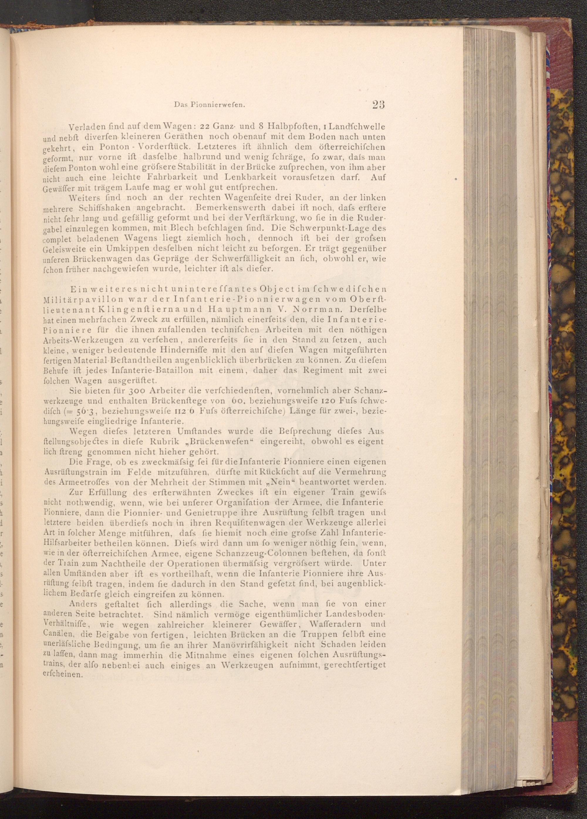 Sie bieten für 300 Arbeiter die verfchiedenften, vornehmlich aber Schanzwerkzeuge und enthalten Brückenftege von 60, beziehungsweife 120 Fufs fchwedifch(= 56.3, beziehungsweife 112 6 Fufs öfterreichifche) Länge für zwei-, beziehungsweife eingliedrige Infanterie.