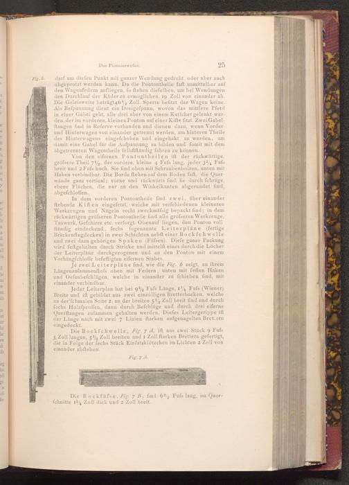 Von den eifernen Pontontheilen ift der rückwärtige, gröfsere Theil 7%, der vordere, kleine 4 Fufs lang, jeder 334 Fufs breit und 2 Fufs hoch. Sie find oben mit Schraubenbolzen, unten mit Haken verbindbar. Die Borde ftehen auf dem Boden faft, die Querwände ganz vertical; vorne und rückwärts find fie durch fchräge, ebene Flächen, die nur an den Winkelkanten abgerundet find, abgefchloffen.