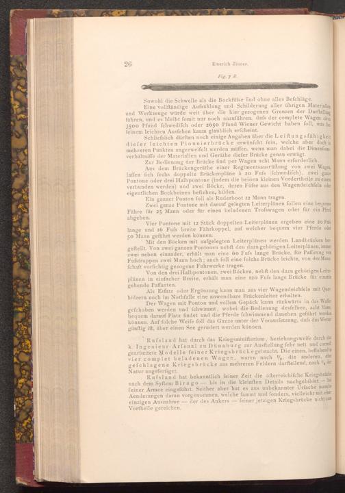 Schliefslich dürften noch einige Angaben über die Leiftungsfähigkeit diefer leichten Pionnierbrücke erwünſcht fein, welche aber doch in mehreren Punkten angezweifelt werden müffen, wenn man dabei die Dimenfions verhältniffe der Materialien und Geräthe diefer Brücke genau erwägt.