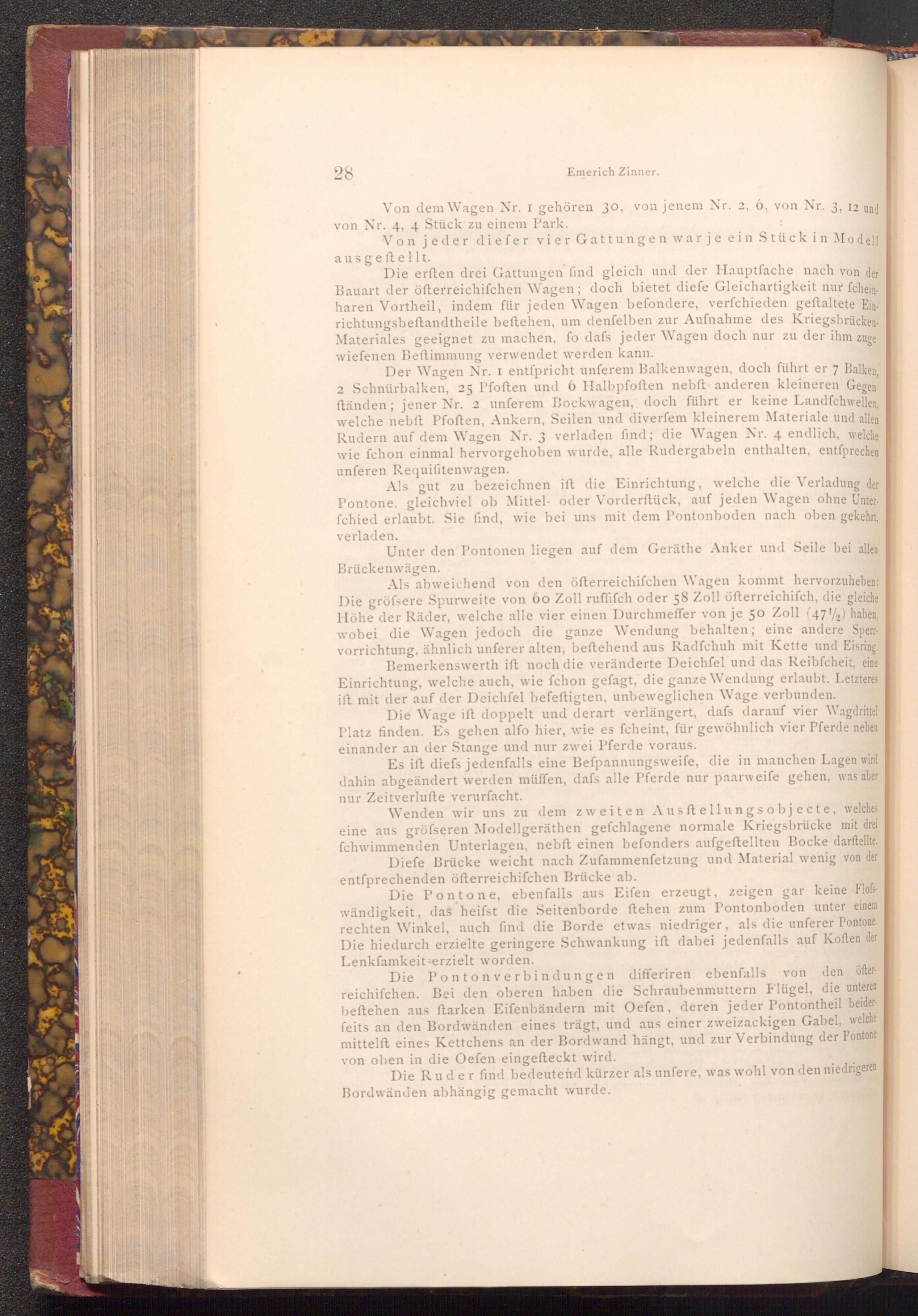 Der Wagen Nr. I entspricht unferem Balkenwagen, doch führt er 7 Balken, 2 Schnürbalken, 25 Pfoften und 6 Halbpfoften nebft anderen kleineren Gegen ftänden; jener Nr. 2 unferem Bockwagen, doch führt er keine Landfchwellen, welche nebft Pfoften, Ankern, Seilen und diverfem kleinerem Materiale und allen Rudern auf dem Wagen Nr. 3 verladen find; die Wagen Nr. 4 endlich, welche wie fchon einmal hervorgehoben wurde, alle Rudergabeln enthalten, entſprechen unferen Requifitenwagen.