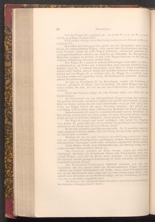 Wenden wir uns zu dem zweiten Ausftellungsobjecte, welches eine aus gröfseren Modellgeräthen gefchlagene normale Kriegsbrücke mit drei fchwimmenden Unterlagen, nebft einen befonders aufgeftellten Bocke darftellte. Diefe Brücke weicht nach Zufammenfetzung und Material wenig von der entfprechenden öfterreichifchen Brücke ab.