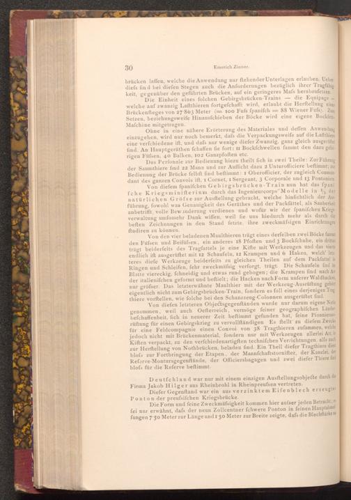 Die Einheit eines folchen Gebirgsbrücken- Trains welche auf zwanzig Laftthieren fortgefchafft wird, erlaubt die Herftellung eines Brückenfteges von 27-863 Meter(= 100 Fufs fpanifch= 88 Wiener Fufs). Zum Setzen, beziehungsweife Hinausfchieben der Böcke wird eine eigene BockfetzMafchine mitgetragen.