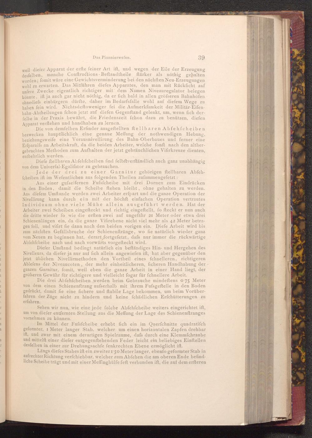 weil diefer Apparat der erfte feiner Art ift, und wegen der Eile der Erzeugung desfelben, manche Conftructions- Beftandtheile ftärker als nöthig gehalten worden; fomit wäre eine Gewichtsverminderung bei den nächften Neu- Erzeugungen wohl zu erwarten. Das Mitführen diefes Apparates, den man mit Rückficht auf unfere Zwecke eigentlich richtiger mit dem Namen Niveauregulator belegen könnte, ift ja auch gar nicht nöthig, da er fich bald in allen gröfseren Bahnhöfen ohnediefs einbürgern dürfte, daher im Bedarfsfalle wohl auf diefem Wege zu haben fein wird. Nichtsdeftoweniger fei die Aufmerkfamkeit der Militär- Eifenbahn- Abtheilungen fchon jetzt auf diefen Gegenftand gelenkt, um, wenn fich derfelbe in der Praxis bewährt, die Friedenszeit fchon dazu zu benützen, diefen Apparat verftehen und handhaben zu lernen.