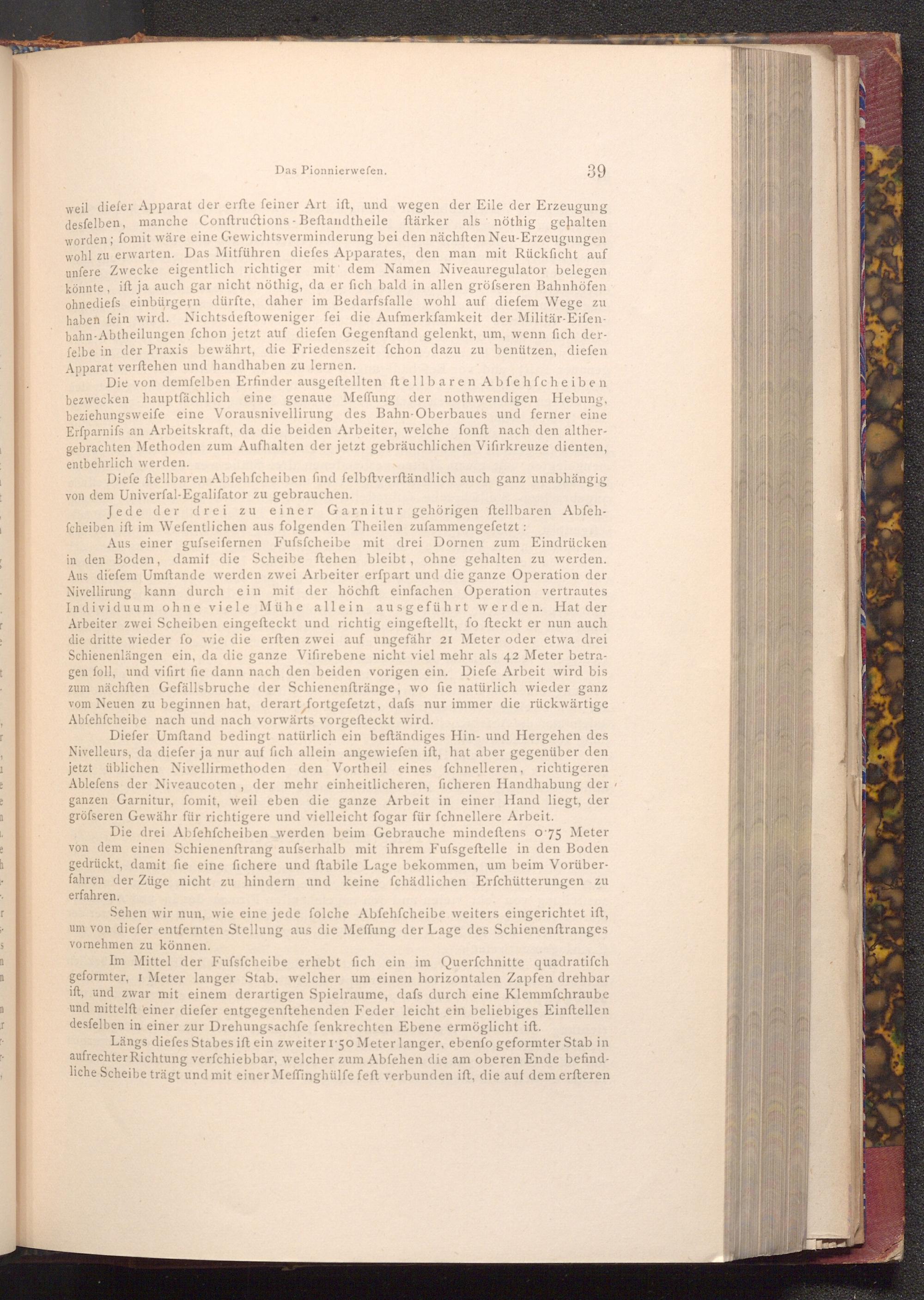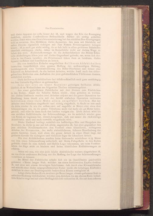 Aus einer gufseifernen Fufsfcheibe mit drei Dornen zum Eindrücken in den Boden, damit die Scheibe ftehen bleibt, ohne gehalten zu werden. Aus diefem Umftande werden zwei Arbeiter erfpart und die ganze Operation der Nivellirung kann durch ein mit der höchft einfachen Operation vertrautes Individuum ohne viele Mühe allein ausgeführt werden. Hat der Arbeiter zwei Scheiben eingefteckt und richtig eingeftellt, fo fteckt er nun auch die dritte wieder fo wie die erften zwei auf ungefähr 21 Meter oder etwa drei Schienenlängen ein, da die ganze Vifirebene nicht viel mehr als 42 Meter betragen foll, und vifirt fie dann nach den beiden vorigen ein. Diefe Arbeit wird bis zum nächsten Gefällsbruche der Schienenftränge, wo fie natürlich wieder ganz vom Neuen zu beginnen hat, derart fortgefetzt, dafs nur immer die rückwärtige Abfehfcheibe nach und nach vorwärts vorgefteckt wird.