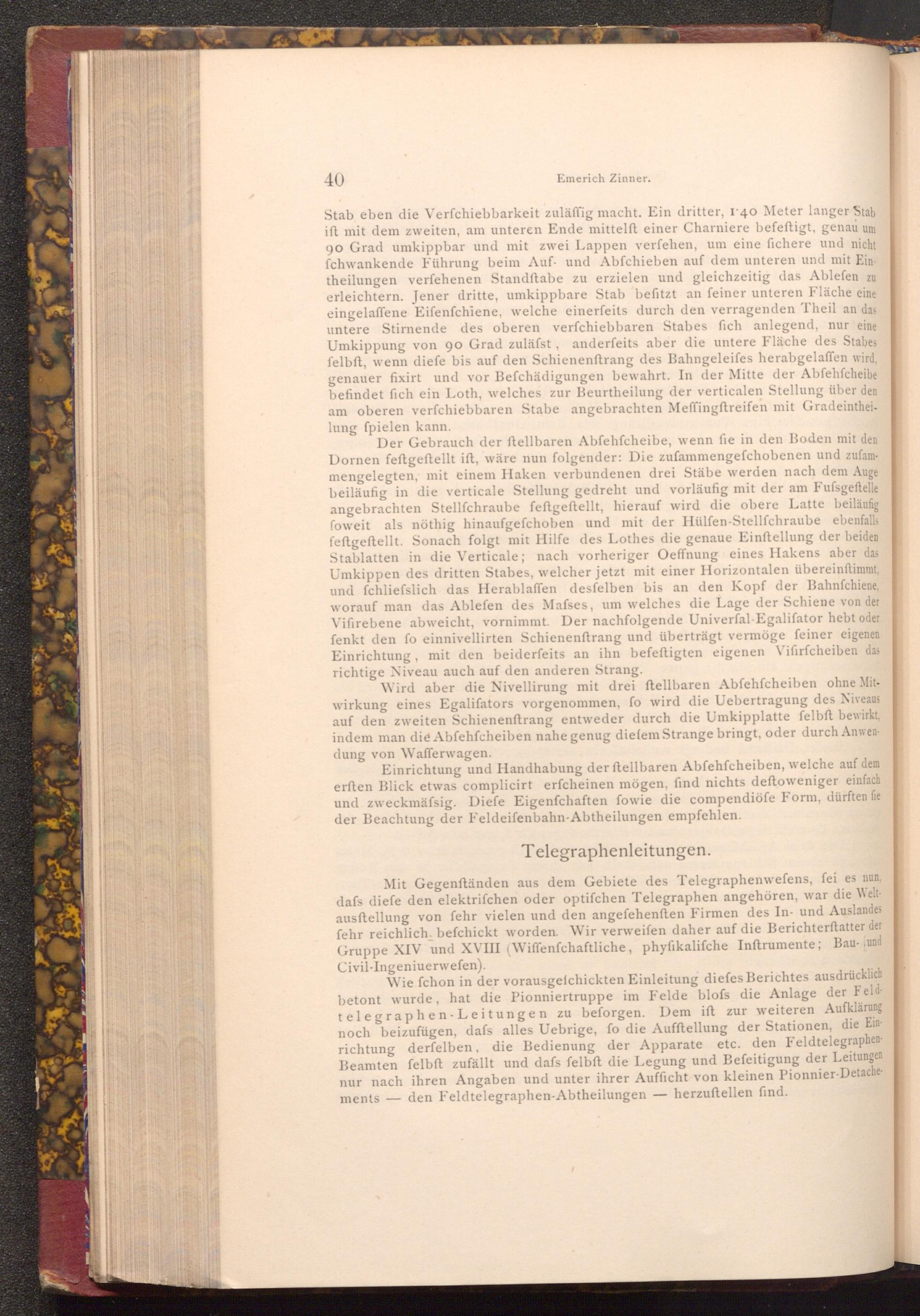 Stab eben die Verfchiebbarkeit zuläffig macht. Ein dritter, 1'40 Meter langer Stab ift mit dem zweiten, am unteren Ende mittelft einer Charniere befeftigt, genau um 90 Grad umkippbar und mit zwei Lappen verfehen, um eine fichere und nicht fchwankende Führung beim Auf- und Abfchieben auf dem unteren und mit Eintheilungen verfehenen Standftabe zu erzielen und gleichzeitig das Ablefen zu erleichtern. Jener dritte, umkippbare Stab befitzt an feiner unteren Fläche eine eingelaffene Eifenfchiene, welche einerfeits durch den verragenden Theil an das untere Stirnende des oberen verfchiebbaren Stabes fich anlegend, nur eine Umkippung von 90 Grad zuläfst, anderfeits aber die untere Fläche des Stabes felbft, wenn diefe bis auf den Schienenftrang des Bahngeleifes herabgelaffen wird, genauer fixirt und vor Befchädigungen bewahrt. In der Mitte der Abfehfcheibe befindet fich ein Loth, welches zur Beurtheilung der verticalen Stellung über den am oberen verfchiebbaren Stabe angebrachten Meffingftreifen mit Gradeintheilung fpielen kann.