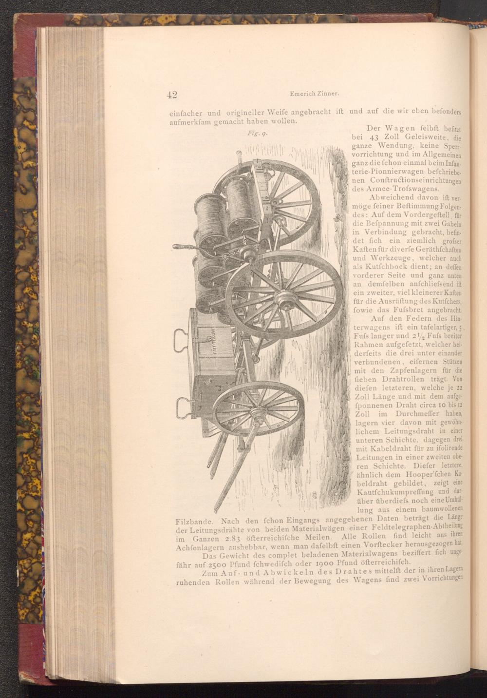 Auf den Federn des Hin terwagens ift ein tafelartiger, 5 Fufs langer und 212 Fufs breiter Rahmen aufgefetzt, welcher beiderfeits die drei unter einander verbundenen, eifernen Stützen mit den Zapfenlagern für die fieben Drahtrollen trägt. Von diefen letzteren, welche je 22 Zoll Länge und mit dem aufgefponnenen Draht circa 10 bis 12 Zoll im Durchmeffer haben, lagern vier davon mit gewöhnlichem Leitungsdraht in einer unteren Schichte, dagegen drei mit Kabeldraht für zu ifolirende Leitungen in einer zweiten oberen Schichte. Diefer letztere, ähnlich dem Hooper'fchen Kabeldraht gebildet, zeigt eine Kautfchukumpreffung und darüber überdiefs noch eine Umhüllung aus einem baumwollenen Filzbande. Nach den fchon Eingangs angegebenen Daten beträgt die Länge der Leitungsdrähte von beiden Materialwägen einer Feldtelegraphen- Abtheilung Alle Rollen find leicht aus ihren im Ganzen 2.83 öfterreichifche Meilen. Achfenlagern aushebbar, wenn man dafelbft einen Vorftecker herausgezogen hat. Das Gewicht des complet beladenen Materialwagens beziffert fich ungefähr auf 2500 Pfund fchwedifch oder 1900 Pfund öfterreichifch.