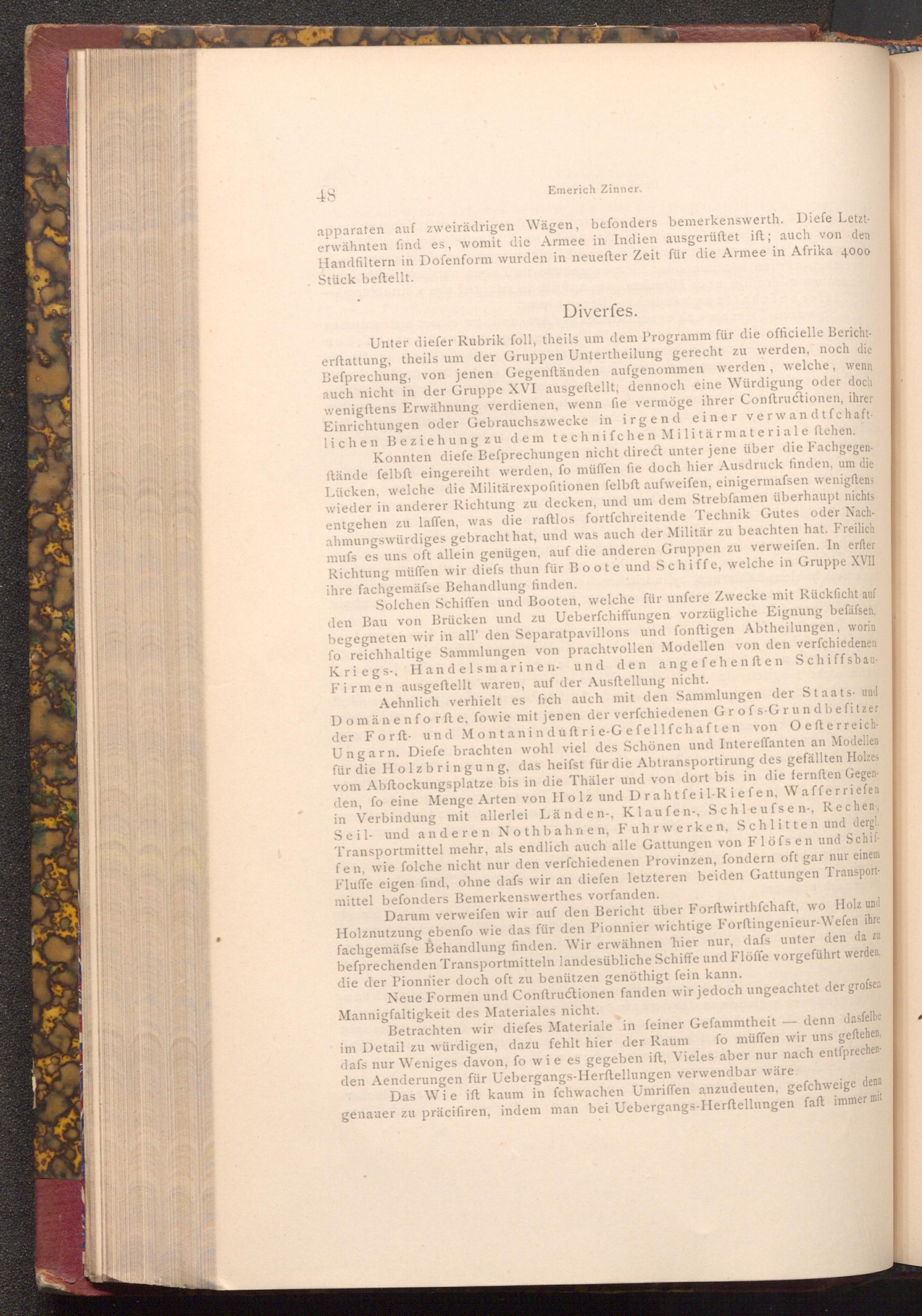 Aehnlich verhielt es fich auch mit den Sammlungen der Staats- und Domänenforfte, fowie mit jenen der verfchiedenen Grofs- Grundbefitzer der Forft- und Montaninduftrie- Gefellfchaften von OefterreichUngarn. Diefe brachten wohl viel des Schönen und Intereffanten an Modellen für die Holzbringung, das heifst für die Abtransportirung des gefällten Holzes vom Abftockungsplatze bis in die Thäler und von dort bis in die fernften Gegenden, fo eine Menge Arten von Holz und Drahtfeil- Riefen, Wafferriefen in Verbindung mit allerlei Länden, Klaufen, Schleufsen, Rechen, Seil und anderen Nothbahnen, Fuhrwerken, Schlitten und dergl. Transportmittel mehr, als endlich auch alle Gattungen von Flöfsen und Schif fen, wie folche nicht nur den verfchiedenen Provinzen, fondern oft gar nur einem Fluffe eigen find, ohne dafs wir an diefen letzteren beiden Gattungen Transportmittel befonders Bemerkenswerthes vorfanden.
