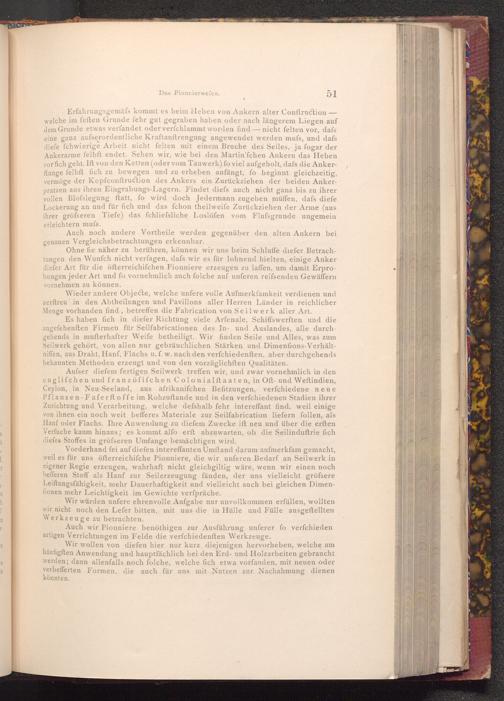 Vorderhand fei auf diefen intereffanten Umftand darum aufmerkfam gemacht, weil es für uns öfterreichifche Pionniere, die wir unferen Bedarf an Seilwerk in eigener Regie erzeugen, wahrhaft nicht gleichgiltig wäre, wenn wir einen noch befferen Stoff als Hanf zur Seilerzeugung fänden, der uns vielleicht grössere Leiftungsfähigkeit, mehr Dauerhaftigkeit und vielleicht auch bei gleichen Dimenfionen mehr Leichtigkeit im Gewichte verfpräche.