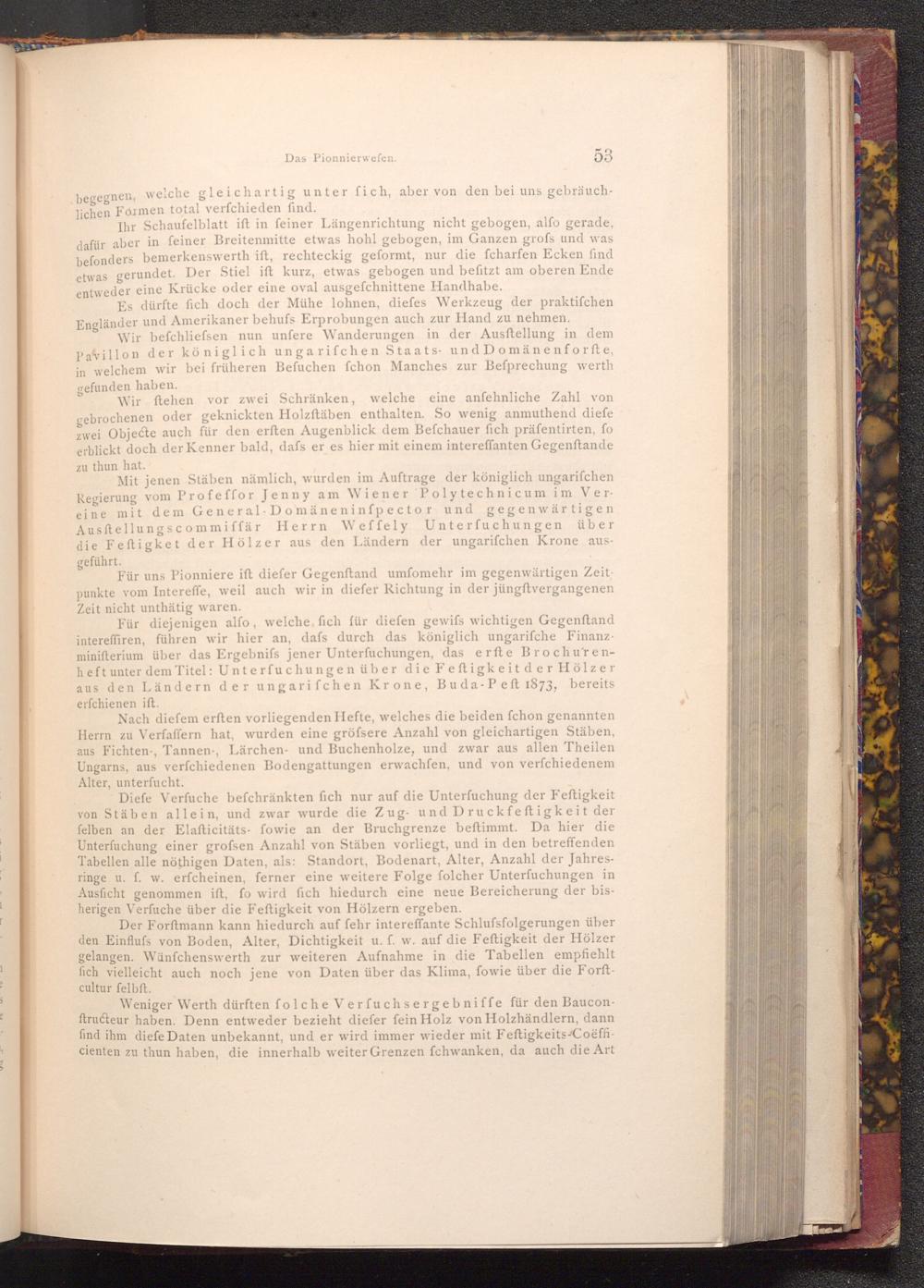 Mit jenen Stäben nämlich, wurden im Auftrage der königlich ungarifchen Regierung vom Profeffor Jenny am Wiener Polytechnicum im Vereine mit dem General Domäneninfpector und gegenwärtigen Ausstellungscommiffär Herrn Weffely Unterfuchungen über die Feftigket der Hölzer aus den Ländern der ungarifchen Krone ausgeführt. Für uns Pionniere ift diefer Gegenftand umfomehr im gegenwärtigen Zeitpunkte vom Intereffe, weil auch wir in diefer Richtung in der jüngftvergangenen Zeit nicht unthätig waren.