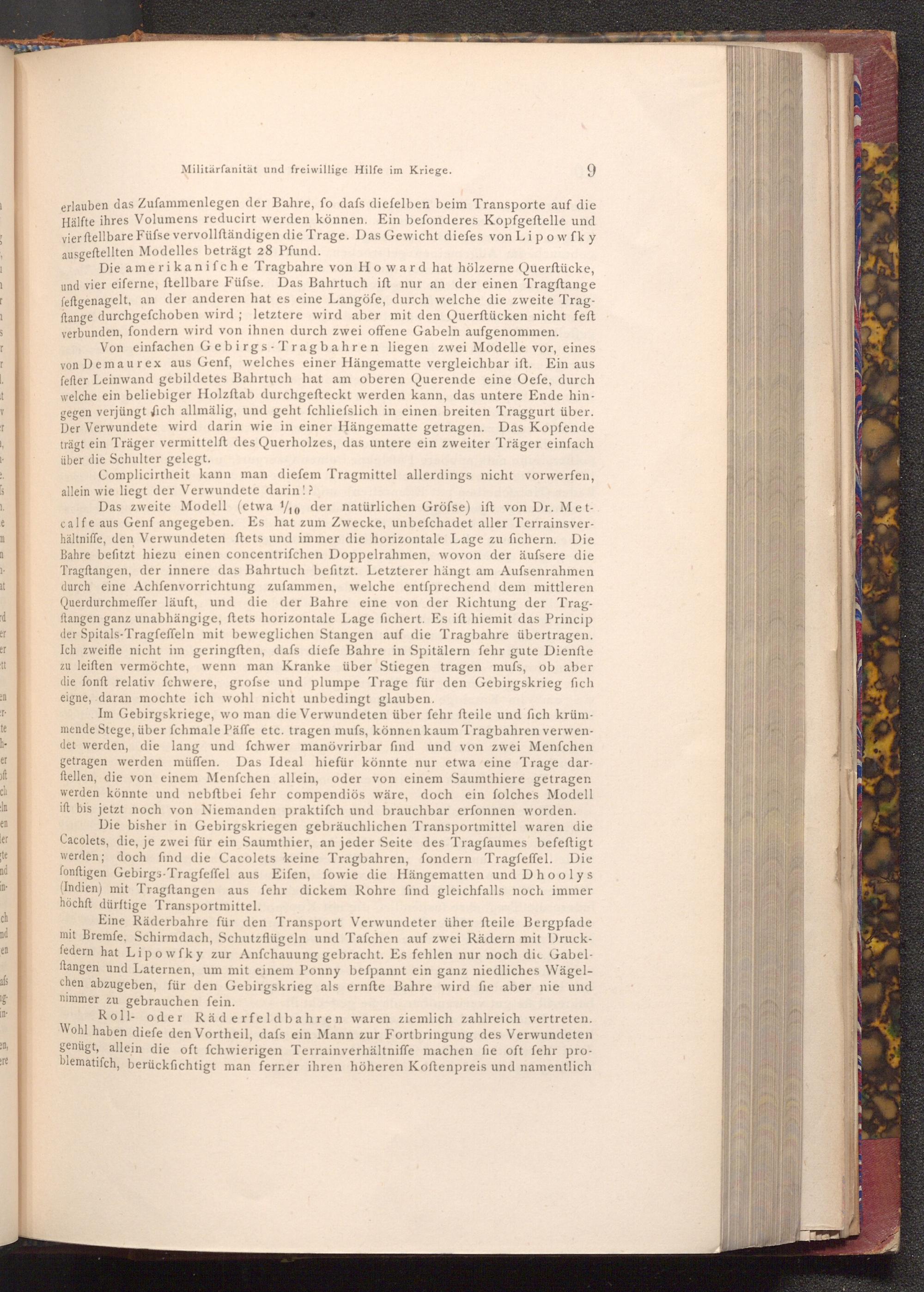 Im Gebirgskriege, wo man die Verwundeten über fehr fteile und fich krümmende Stege, über fchmale Päffe etc. tragen mufs, können kaum Tragbahren verwendet werden, die lang und fchwer manövrirbar find und von zwei Menfchen getragen werden müffen. Das Ideal hiefür könnte nur etwa eine Trage darftellen, die von einem Menfchen allein, oder von einem Saumthiere getragen werden könnte und nebftbei fehr compendiös wäre, doch ein folches Modell ift bis jetzt noch von Niemanden praktiſch und brauchbar erfonnen worden.