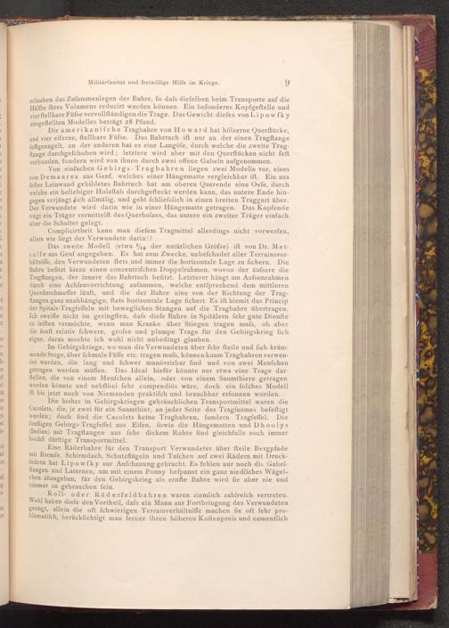 Roll- oder Räderfeldbahren waren ziemlich zahlreich vertreten. Wohl haben diefe den Vortheil, dafs ein Mann zur Fortbringung des Verwundeten genügt, allein die oft fchwierigen Terrainverhältniffe machen fie oft fehr problematifch, berücksichtigt man ferner ihren höheren Koftenpreis und namentlich
