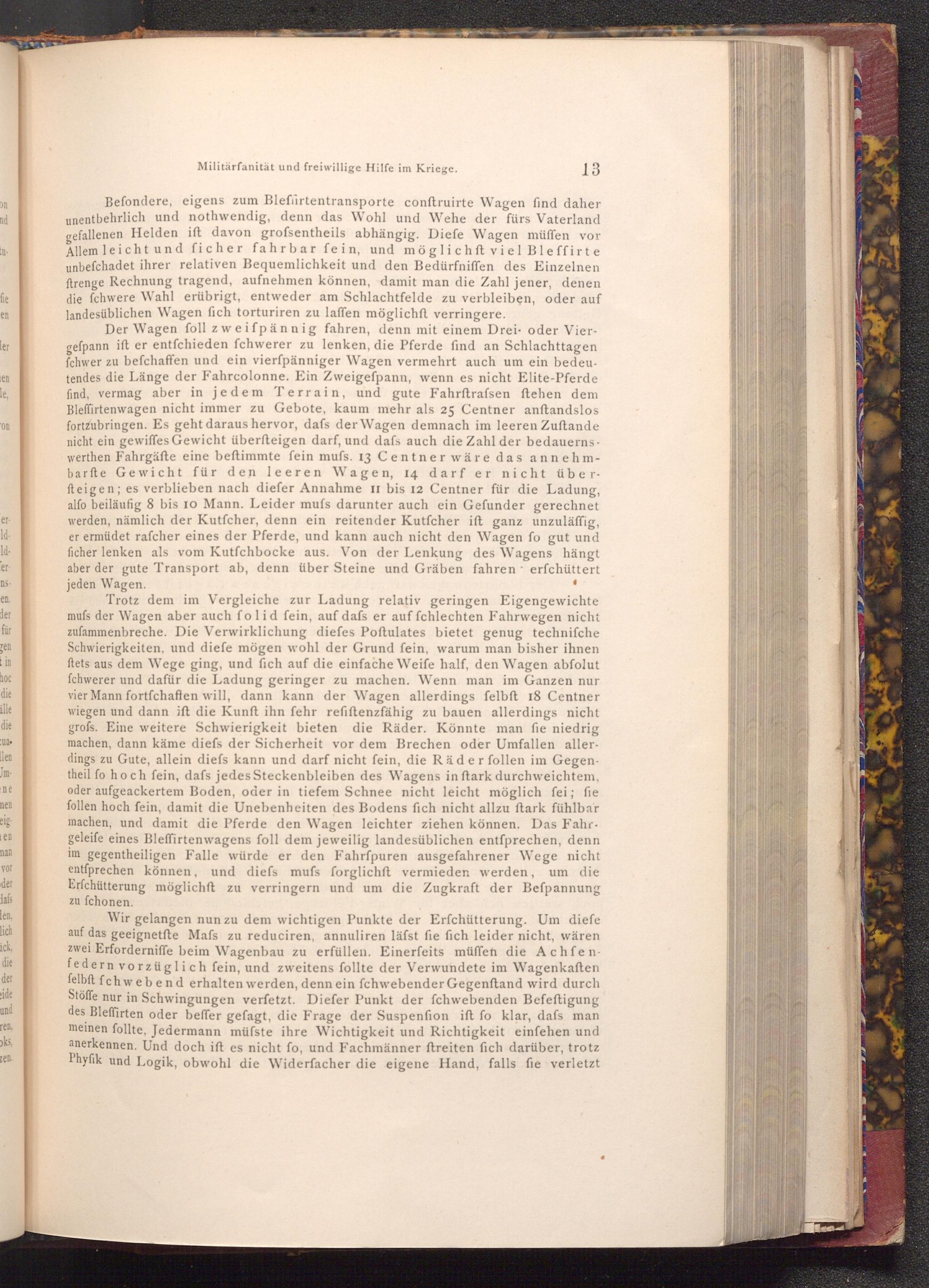 Befondere, eigens zum Bleflirtentransporte conftruirte Wagen find daher unentbehrlich und nothwendig, denn das Wohl und Wehe der fürs Vaterland gefallenen Helden ift davon grofsentheils abhängig. Diefe Wagen müffen vor Allem leicht und ficher fahrbar fein, und möglichst viel Bleffirte unbefchadet ihrer relativen Bequemlichkeit und den Bedürfniffen des Einzelnen ftrenge Rechnung tragend, aufnehmen können, damit man die Zahl jener, denen die fchwere Wahl erübrigt, entweder am Schlachtfelde zu verbleiben, oder auf landesüblichen Wagen fich torturiren zu laffen möglichft verringere.
