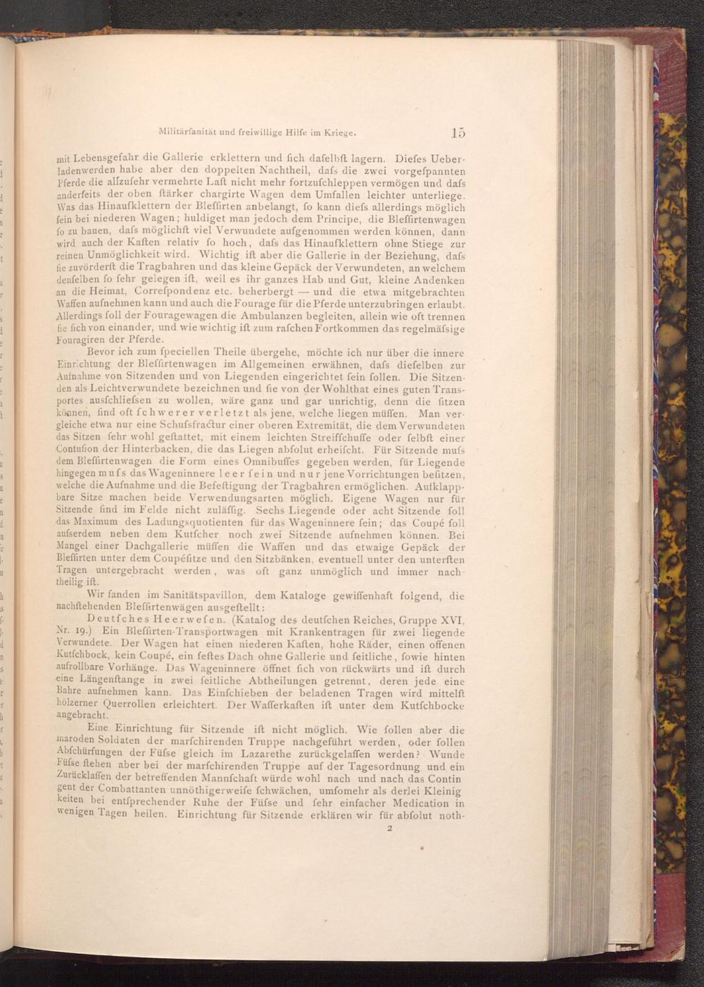 Deutfches Heerwefen.( Katalog des deutfchen Reiches, Gruppe XVI, Nr. 19.) Ein Bleffirten- Transportwagen mit Krankentragen für zwei liegende Verwundete. Der Wagen hat einen niederen Kaften, hohe Räder, einen offenen Kutfchbock, kein Coupé, ein feftes Dach ohne Gallerie und feitliche, fowie hinten aufrollbare Vorhänge. Das Wageninnere öffnet fich von rückwärts und ift durch eine Längenftange in zwei feitliche Abtheilungen getrennt, deren jede eine Bahre aufnehmen kann. Das Einfchieben der beladenen Tragen wird mittelft hölzerner Querrollen erleichtert. Der Wafferkaften ift unter dem Kutfchbocke angebracht.