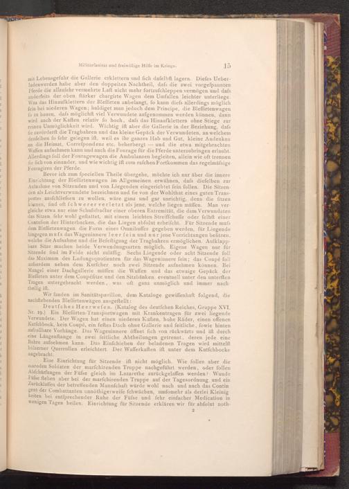 Bevor ich zum fpeciellen Theile übergehe, möchte ich nur über die innere Einrichtung der Bleffirtenwagen im Allgemeinen erwähnen, dafs diefelben zur Aufnahme von Sitzenden und von Liegenden eingerichtet fein follen. Die Sitzenden als Leichtverwundete bezeichnen und fie von der Wohlthat eines guten Transportes ausfchliefsen zu wollen, wäre ganz und gar unrichtig, denn die fitzen können, find oft fchwerer verletzt als jene, welche liegen müffen. Man vergleiche etwa nur eine Schufsfractur einer oberen Extremität, die dem Verwundeten das Sitzen fehr wohl geftattet, mit einem leichten Streiffchuffe oder felbft einer Contufion der Hinterbacken, die das Liegen abfolut erheifcht. Für Sitzende mufs dem Bleffirtenwagen die Form eines Omnibuffes gegeben werden, für Liegende hingegen mufs das Wageninnere leer fein und nur jene Vorrichtungen befitzen, welche die Aufnahme und die Befeftigung der Tragbahren ermöglichen. Aufklappbare Sitze machen beide Verwendungsarten möglich. Eigene Wagen nur für Sitzende find im Felde nicht zuläffig. Sechs Liegende oder acht Sitzende foll das Maximum des Ladungsquotienten für das Wageninnere fein; das Coupé foll aufserdem neben dem Kutfcher noch zwei Sitzende aufnehmen können. Bei Mangel einer Dachgallerie müffen die Waffen und das etwaige Gepäck der Bleffirten unter dem Coupéfitze und den Sitzbänken, eventuell unter den unterften Tragen untergebracht werden, was oft ganz unmöglich und immer nach theilig ift.