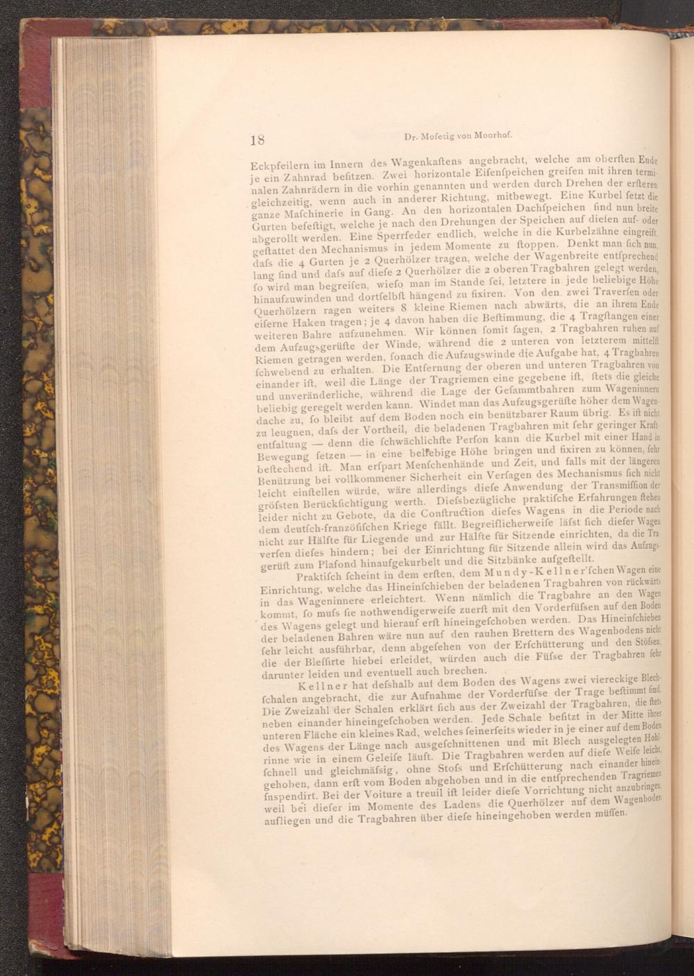 Praktiſch fcheint in dem erften, dem Mundy- Kellner'fchen Wagen eine Einrichtung, welche das Hineinfchieben der beladenen Tragbahren von rückwärts in das Wageninnere erleichtert. Wenn nämlich die Tragbahre an den Wagen kommt, fo mufs fie nothwendigerweife zuerft mit den Vorderfüfsen auf den Boden des Wagens gelegt und hierauf erft hineingefchoben werden. Das Hineinfchieben der beladenen Bahren wäre nun auf den rauhen Brettern des Wagenbodens nicht fehr leicht ausführbar, denn abgefehen von der Erfchütterung und den Stöfsen, die der Bleffirte hiebei erleidet, würden auch die Füfse der Tragbahren fehr darunter leiden und eventuell auch brechen.