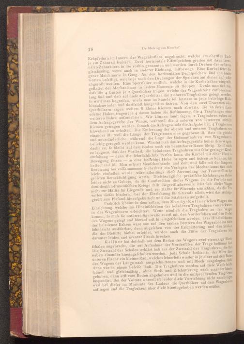 Eckpfeilern im Innern des Wagenkaftens angebracht, welche am oberften Ende je ein Zahnrad befitzen. Zwei horizontale Eifenfpeichen greifen mit ihren termi nalen Zahnrädern in die vorhin genannten und werden durch Drehen der erfteren gleichzeitig, wenn auch in anderer Richtung, mitbewegt. Eine Kurbel fetzt die ganze Mafchinerie in Gang. An den horizontalen Dachfpeichen find nun breite Gurten befeftigt, welche je nach den Drehungen der Speichen auf diefen auf- oder abgerollt werden. Eine Sperrfeder endlich, welche in die Kurbelzähne eingreift. geftattet den Mechanismus in jedem Momente zu ftoppen. Denkt man fich nun, dafs die 4 Gurten je 2 Querhölzer tragen, welche der Wagenbreite entſprechend lang find und dafs auf diefe 2 Querhölzer die 2 oberen Tragbahren gelegt werden, fo wird man begreifen, wiefo man im Stande fei, letztere in jede beliebige Höhe hinaufzuwinden und dortfelbft hängend zu fixiren. Von den zwei Traverfen oder Querhölzern ragen weiters 8 kleine Riemen nach abwärts, die an ihrem Ende eiferne Haken tragen; je 4 davon haben die Beftimmung, die 4 Tragftangen einer weiteren Bahre aufzunehmen. Wir können fomit fagen, 2 Tragbahren ruhen auf dem Aufzugsgerüfte der Winde, während die 2 unteren von letzterem mittelft Riemen getragen werden, fonach die Aufzugswinde die Aufgabe hat, 4 Tragbahren fchwebend zu erhalten. Die Entfernung der oberen und unteren Tragbahren von einander ift, weil die Länge der Tragriemen eine gegebene ift, ftets die gleiche und unveränderliche, während die Lage der Gefammtbahren zum Wageninnern beliebig geregelt werden kann. Windet man das Aufzugsgerüfte höher dem Wagendache zu, fo bleibt auf dem Boden noch ein benützbarer Raum übrig. Es iſt nicht zu leugnen, dafs der Vortheil, die beladenen Tragbahren mit fehr geringer Kraftentfaltung denn die fchwächlichfte Perfon kann die Kurbel mit einer Hand in Bewegung fetzen in eine belfebige Höhe bringen und fixiren zu können, fehr beftechend ift. Man erfpart Menfchenhände und Zeit, und falls mit der längeren Benützung bei vollkommener Sicherheit ein Verfagen des Mechanismus fich nicht leicht einftellen würde, wäre allerdings diefe Anwendung der Transmiffion der gröfsten Berücksichtigung werth. Diefsbezügliche praktiſche Erfahrungen ſtehen leider nicht zu Gebote, da die Conftruction diefes Wagens in die Periode nach dem deutfch- franzöfifchen Kriege fällt. Begreiflicherweife läfst fich diefer Wagen nicht zur Hälfte für Liegende und zur Hälfte für Sitzende einrichten, da die Tra verfen diefes hindern; bei der Einrichtung für Sitzende allein wird das Aufzugs gerüft zum Plafond hinaufgekurbelt und die Sitzbänke aufgeftellt.