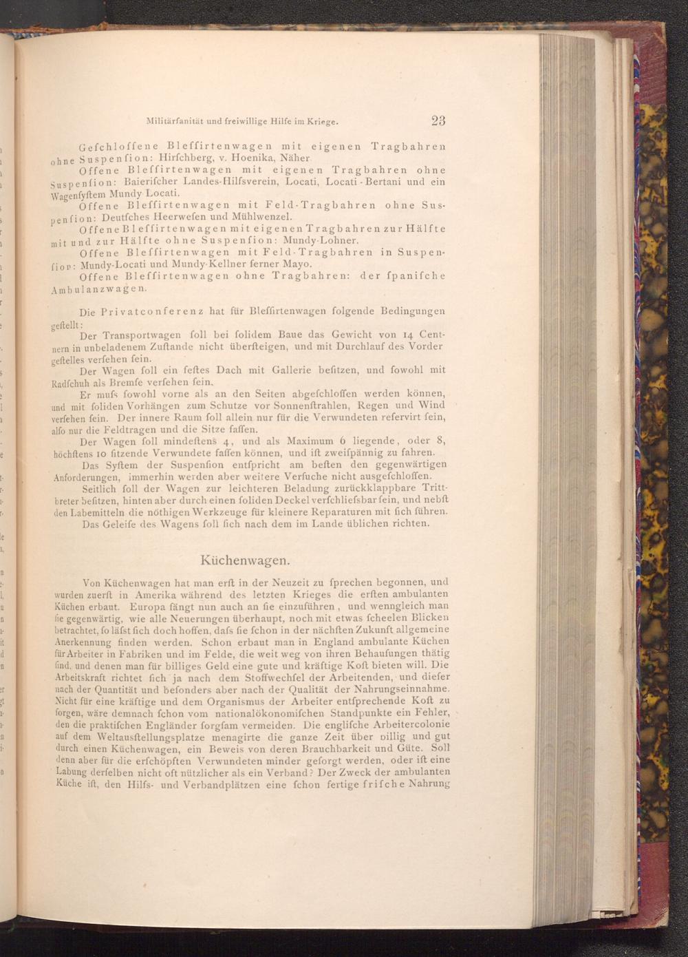 Er mufs fowohl vorne als an den Seiten abgefchloffen werden können, und mit foliden Vorhängen zum Schutze vor Sonnenftrahlen, Regen und Wind verfehen fein. Der innere Raum foll allein nur für die Verwundeten refervirt fein, alfo nur die Feldtragen und die Sitze faffen.