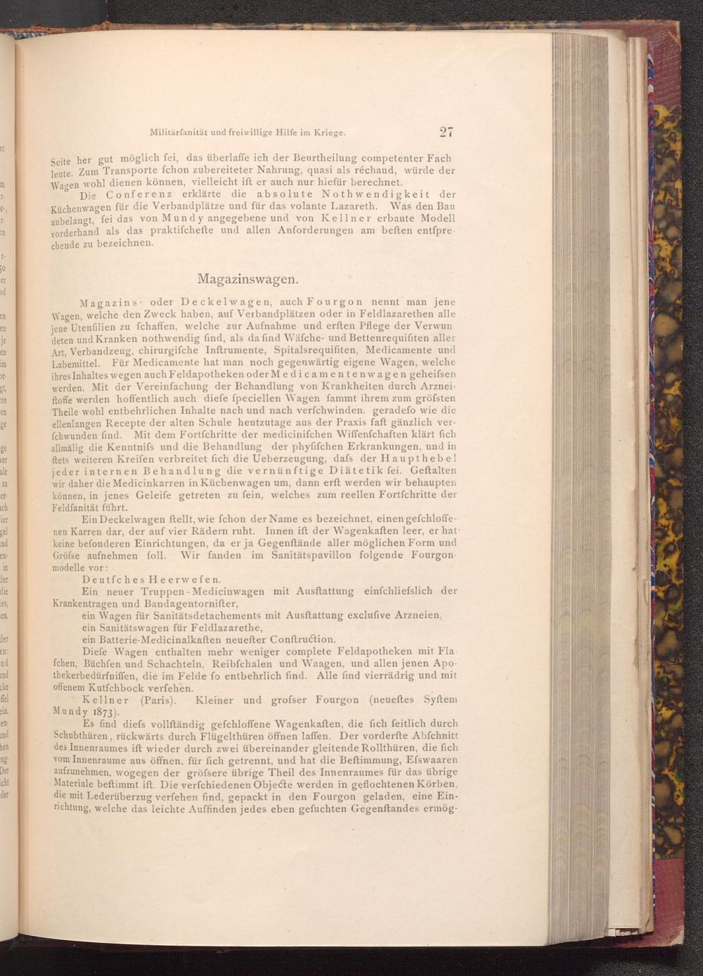 Magazins oder Deckelwagen, auch Fourgon nennt man jene Wagen, welche den Zweck haben, auf Verbandplätzen oder in Feldlazarethen alle jene Utenfilien zu fchaffen, welche zur Aufnahme und erften Pflege der Verwun deten und Kranken nothwendig find, als da find Wäfche- und Bettenrequifiten aller Art, Verbandzeug, chirurgifche Inftrumente, Spitals requifiten, Medicamente und Labemittel. Für Medicamente hat man noch gegenwärtig eigene Wagen, welche ihres Inhaltes wegen auch Feldapotheken oder Medicamentenwagen geheifsen werden. Mit der Vereinfachung der Behandlung von Krankheiten durch Arzneiftoffe werden hoffentlich auch diefe fpeciellen Wagen fammt ihrem zum gröfsten Theile wohl entbehrlichen Inhalte nach und nach verfchwinden. geradefo wie die ellenlangen Recepte der alten Schule heutzutage aus der Praxis faft gänzlich verfchwunden find. Mit dem Fortfchritte der medicinifchen Wiffenfchaften klärt fich allmälig die Kenntnifs und die Behandlung der phyfifchen Erkrankungen, und in ftets weiteren Kreifen verbreitet fich die Ueberzeugung, dafs der Haupthebel jeder internen Behandlung die vernünftige Diätetik fei. Geftalten wir daher die Medicinkarren in Küchenwagen um, dann erft werden wir behaupten können, in jenes Geleife getreten zu fein, welches zum reellen Fortfchritte der Feldfanität führt.