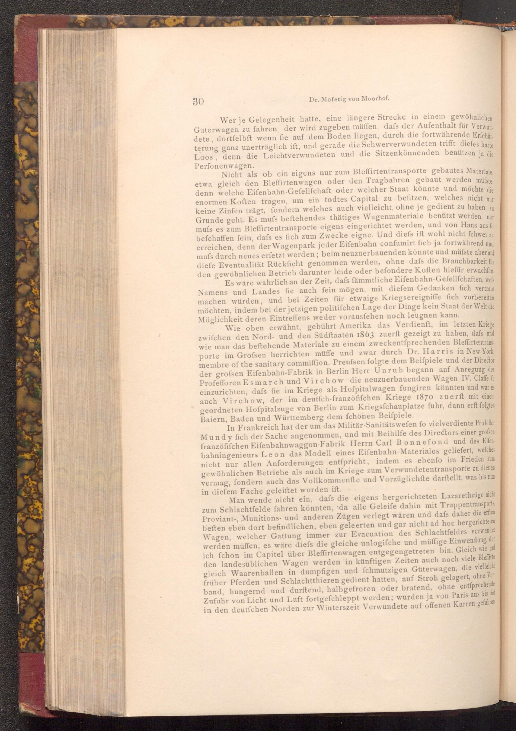Wie oben erwähnt, gebührt Amerika das Verdienft, im letzten Kriege zwifchen den Nord- und den Südftaaten 1863 zuerft gezeigt zu haben, dafs und wie man das beſtehende Materiale zu einem zweckentfprechenden Bleffirtentransporte im Grofsen herrichten müffe und zwar durch Dr. Harris in New- York, membre of the sanitary commiffion. Preufsen folgte dem Beiſpiele und der Director der grofsen Eifenbahn- Fabrik in Berlin Herr Unruh begann auf Anregung der Profefforen Es march und Virchow die neuzuerbauenden Wagen IV. Claffe fo einzurichten, dafs fie im Kriege als Hofpitalwagen fungiren könnten und war es auch Virchow, der im deutfch- franzöfifchen Kriege 1870 zuerft mit einem geordneten Hofpitalzuge von Berlin zum Kriegsfchauplatze fuhr, dann erft folgten Baiern, Baden und Württemberg dem fchönen Beiſpiele.