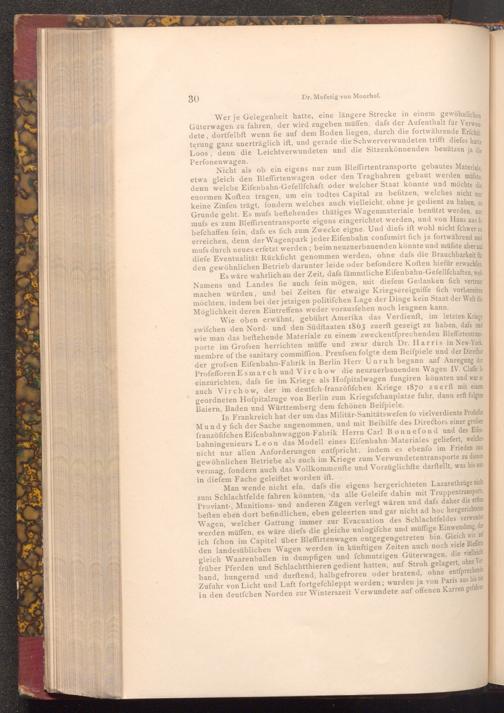 In Frankreich hat der um das Militär- Sanitätswefen fo vielverdiente Profeffor Mundy fich der Sache angenommen, und mit Beihilfe des Directors einer grofsen franzöfifchen Eifenbahnwaggon- Fabrik Herrn Carl Bonnefond und des Eifenbahningenieurs Leon das Modell eines Eifenbahn- Materiales geliefert, welches nicht nur allen Anforderungen entſpricht, indem es ebenfo im Frieden zum gewöhnlichen Betriebe als auch im Kriege zum Verwundetentransporte zu dienen vermag, fondern auch das Vollkommenfte und Vorzüglichfte darftellt, was bis nun in diefem Fache geleiftet worden ift.