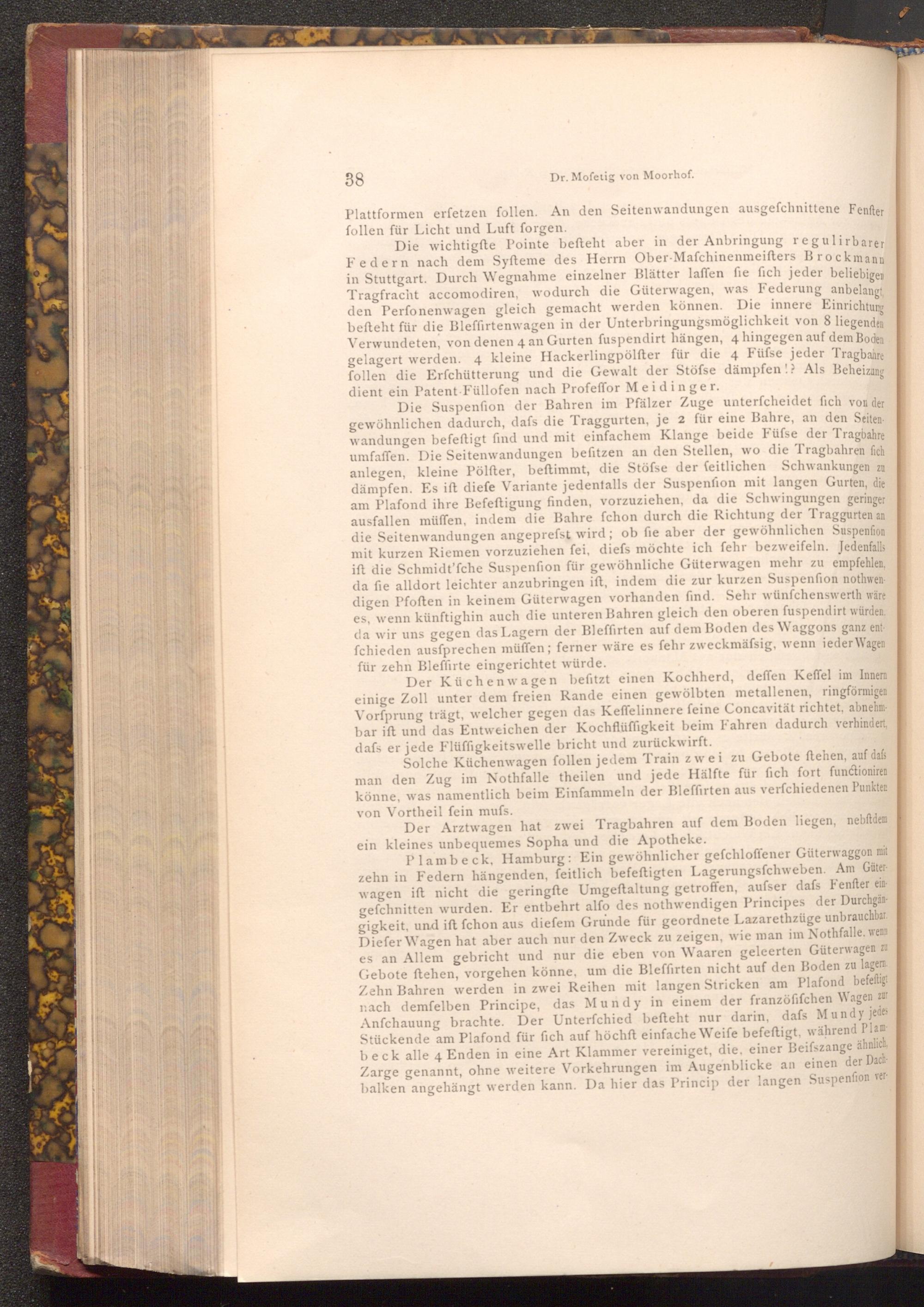 Die wichtigfte Pointe befteht aber in der Anbringung regulirbarer Federn nach dem Syfteme des Herrn Ober- Mafchinenmeifters Brockmann in Stuttgart. Durch Wegnahme einzelner Blätter laffen fie fich jeder beliebigen Tragfracht accomodiren, wodurch die Güterwagen, was Federung anbelangt, den Perfonenwagen gleich gemacht werden können. Die innere Einrichtung befteht für die Bleffirtenwagen in der Unterbringungsmöglichkeit von 8 liegenden Verwundeten, von denen 4 an Gurten fuspendirt hängen, 4 hingegen auf dem Boden gelagert werden. 4 kleine Hackerlingpölfter für die 4 Füfse jeder Tragbare follen die Erfchütterung und die Gewalt der Stöfse dämpfen!? Als Beheizung dient ein Patent Füllofen nach Profeffor Meidinger.