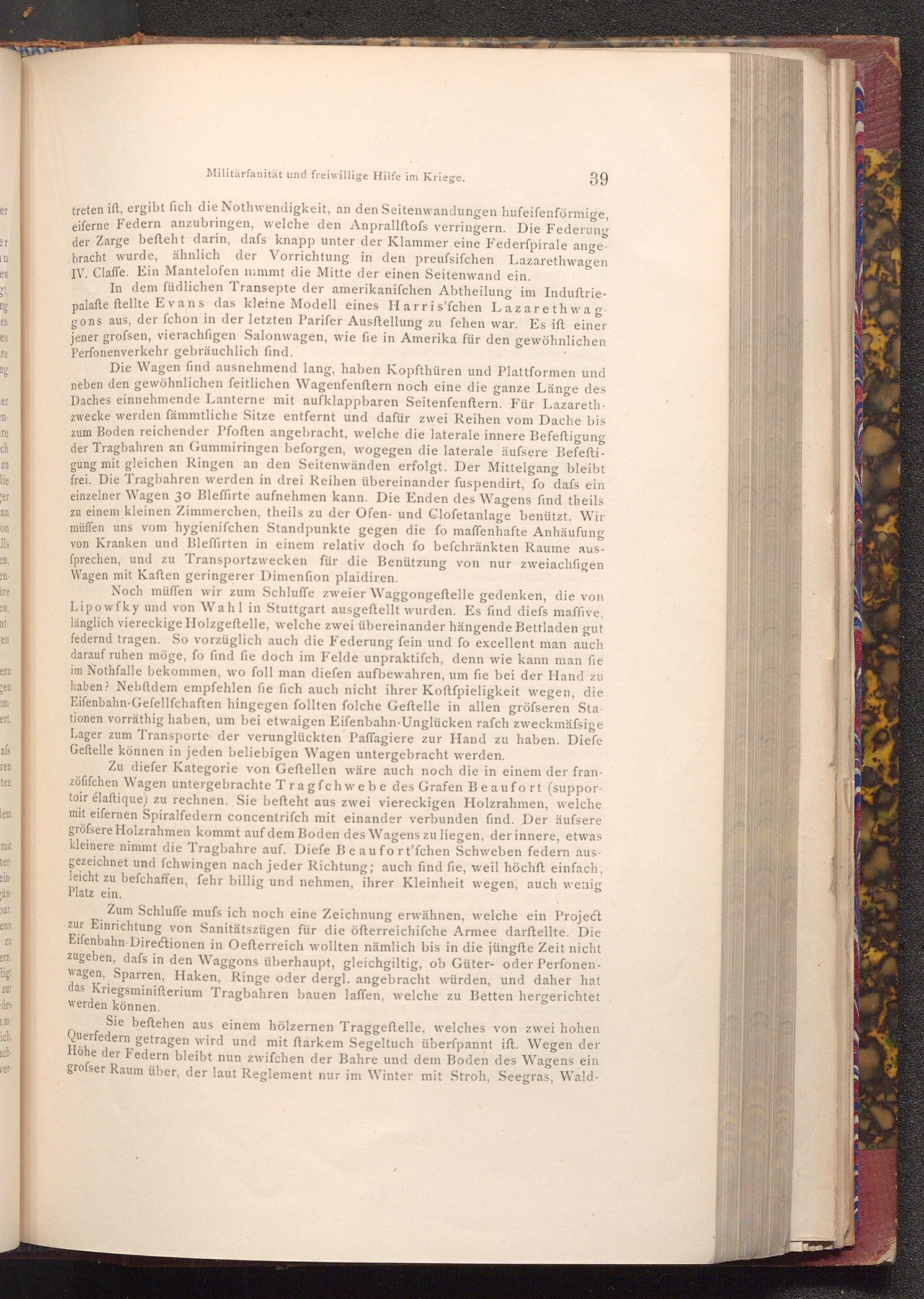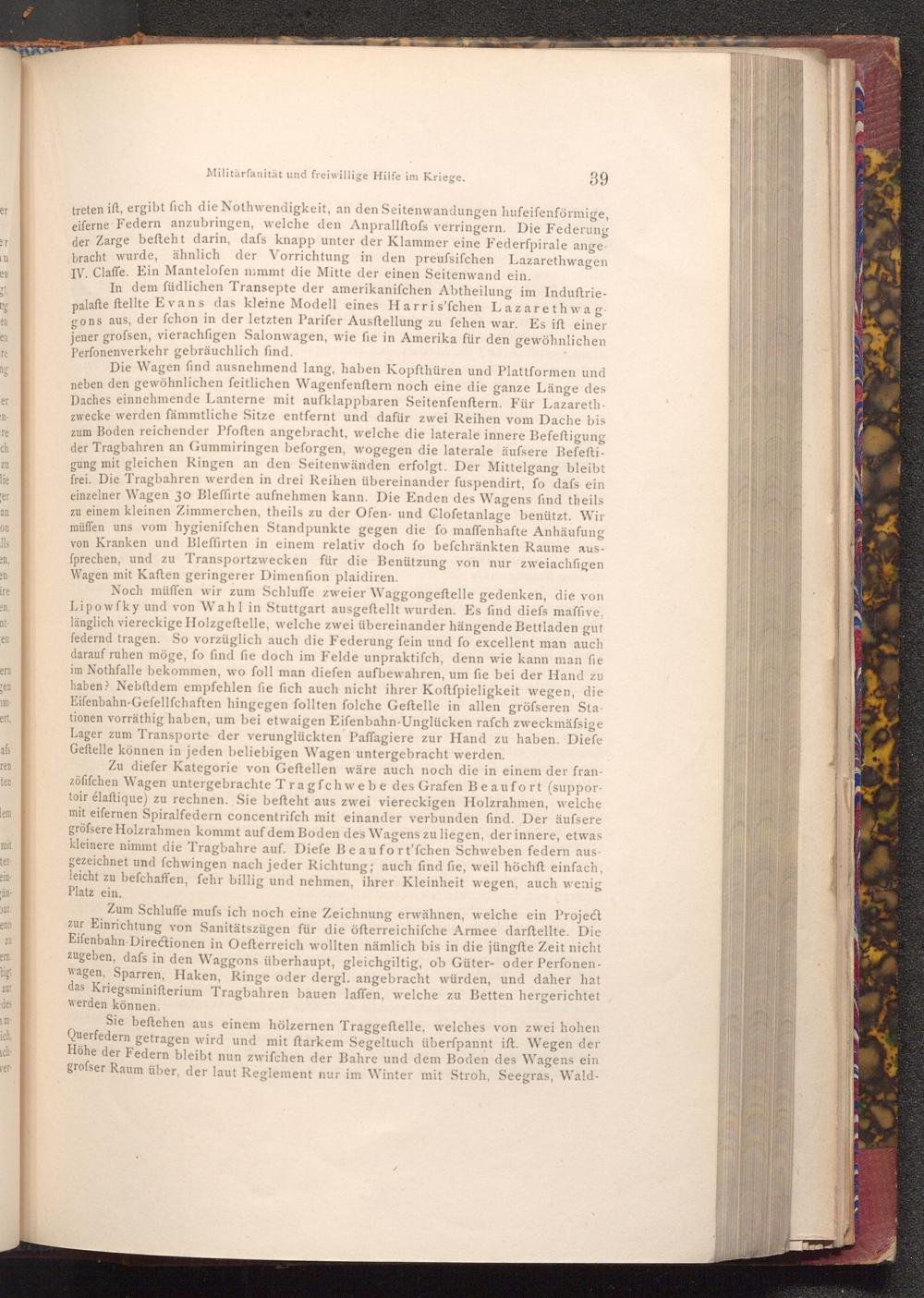 Die Wagen find ausnehmend lang, haben Kopfthüren und Plattformen und neben den gewöhnlichen feitlichen Wagenfenftern noch eine die ganze Länge des Daches einnehmende Lanterne mit aufklappbaren Seitenfenftern. Für Lazarethzwecke werden fämmtliche Sitze entfernt und dafür zwei Reihen vom Dache bis zum Boden reichender Pfoften angebracht, welche die laterale innere Befeftigung der Tragbahren an Gummiringen beforgen, wogegen die laterale äufsere Befeftigung mit gleichen Ringen an den Seitenwänden erfolgt. Der Mittelgang bleibt frei. Die Tragbahren werden in drei Reihen übereinander fuspendirt, fo dafs ein einzelner Wagen 30 Bleffirte aufnehmen kann. Die Enden des Wagens find theils zu einem kleinen Zimmerchen, theils zu der Ofen- und Clofetanlage benützt. Wir müffen uns vom hygienifchen Standpunkte gegen die fo maffenhafte Anhäufung von Kranken und Bleffirten in einem relativ doch fo befchränkten Raume ausfprechen, und zu Transportzwecken für die Benützung von nur zweiachfigen Wagen mit Kaften geringerer Dimenfion plaidiren.