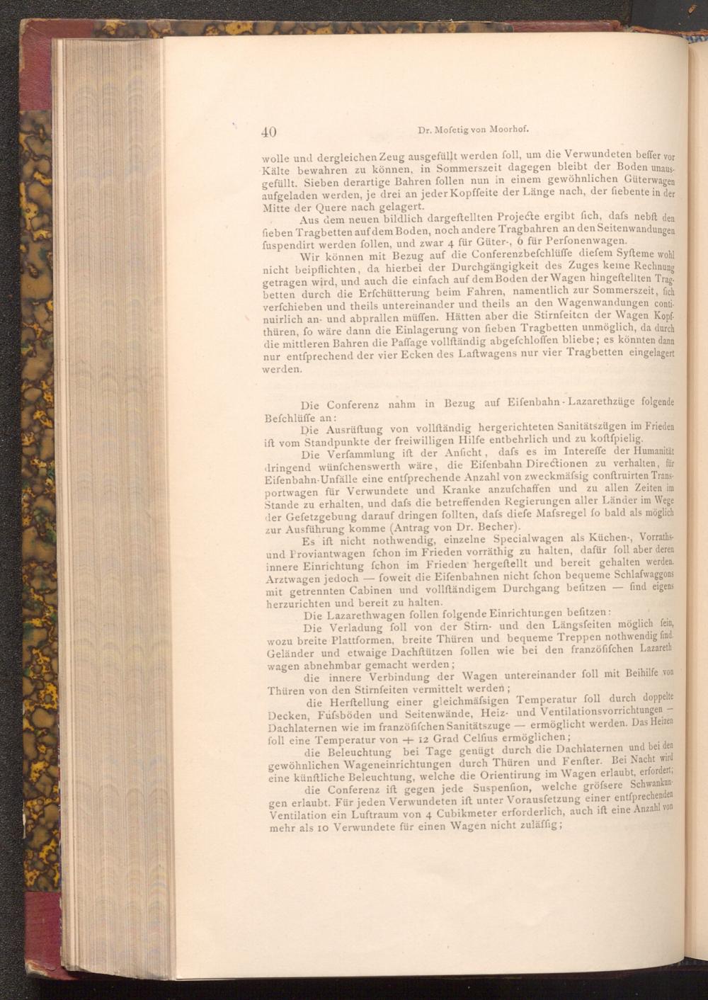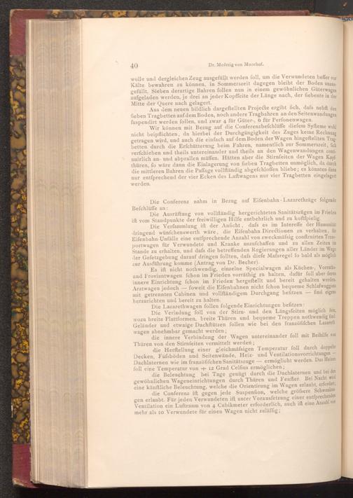 Die Verfammlung ift der Anficht, dafs es im Intereffe der Humanität dringend wünſchenswerth wäre, die Eifenbahn Directionen zu verhalten, für Eifenbahn- Unfälle eine entsprechende Anzahl von zweckmäfsig conftruirten Transportwagen für Verwundete und Kranke anzufchaffen und zu allen Zeiten im Stande zu erhalten, und dafs die betreffenden Regierungen aller Länder im Wege der Gefetzgebung darauf dringen follten, dafs diefe Mafsregel fo bald als möglich zur Ausführung komme( Antrag von Dr. Becher).