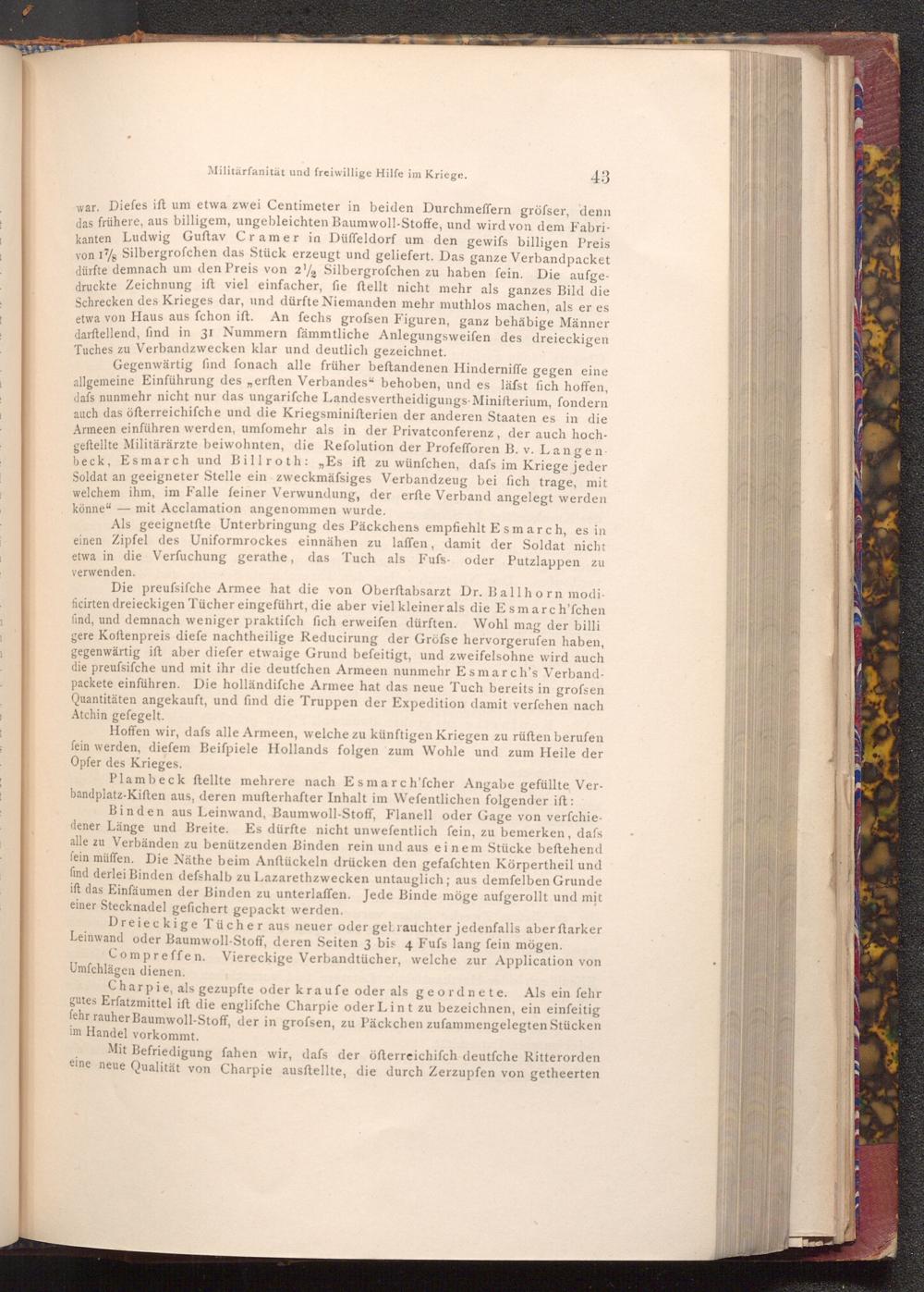 Die preufsifche Armee hat die von Oberftabsarzt Dr. Ballhorn modificirten dreieckigen Tücher eingeführt, die aber viel kleiner als die Esmarch'fchen find, und demnach weniger praktiſch fich erweifen dürften. Wohl mag der billi gere Koftenpreis diefe nachtheilige Reducirung der Gröfse hervorgerufen haben, gegenwärtig ist aber diefer etwaige Grund befeitigt, und zweifelsohne wird auch die preufsifche und mit ihr die deutfchen Armeen nunmehr Esmarch's Verbandpackete einführen. Die holländifche Armee hat das neue Tuch bereits in grofsen Quantitäten angekauft, und find die Truppen der Expedition damit verfehen nach Atchin gefegelt.
