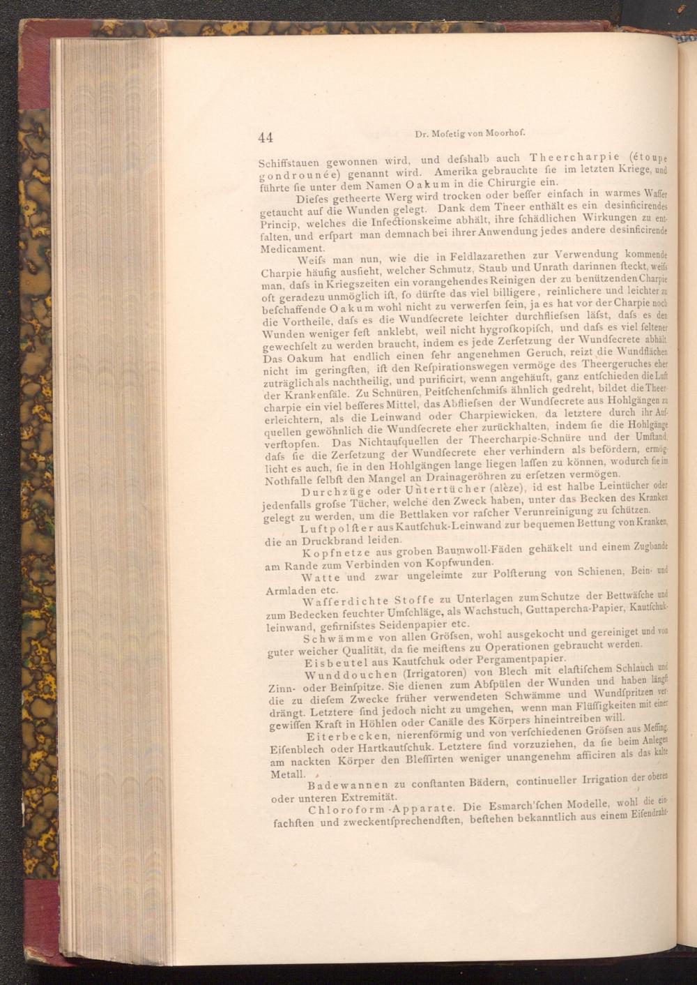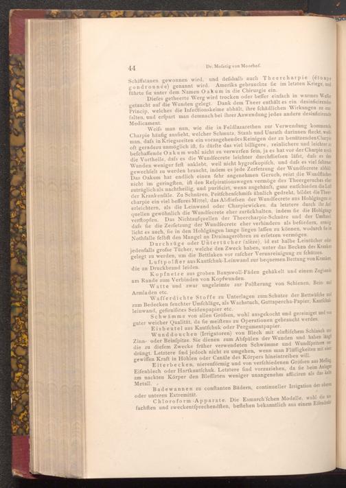 Weifs man nun, wie die in Feldlazarethen zur Verwendung kommende Charpie häufig ausfieht, welcher Schmutz, Staub und Unrath darinnen fteckt, weifs man, dafs in Kriegszeiten ein vorangehendes Reinigen der zu benützenden Charpie oft geradezu unmöglich ift, fo dürfte das viel billigere, reinlichere und leichter zu befchaffende Oakum wohl nicht zu verwerfen fein, ja es hat vor der Charpie noch die Vortheile, dafs es die Wundfecrete leichter durchfliefsen läfst, dafs es den Wunden weniger feft anklebt, weil nicht hygrofkopifch, und dafs es viel feltener gewechfelt zu werden braucht, indem es jede Zerfetzung der Wundfecrete abhält. Das Oakum hat endlich einen fehr angenehmen Geruch, reizt die Wundflächen nicht im geringften, ift den Refpirationswegen vermöge des Theergeruches eher zuträglich als nachtheilig, und purificirt, wenn angehäuft, ganz entfchieden die Luft der Krankenfäle. Zu Schnüren, Peitfchenfchmifs ähnlich gedreht, bildet die Theer charpie ein viel befferes Mittel, das Abfliefsen der Wundfecrete aus Hohlgängen zu erleichtern, als die Leinwand oder Charpiewicken, da letztere durch ihr Aufquellen gewöhnlich die Wundfecrete eher zurückhalten, indem fie die Hohlgänge verftopfen. Das Nichtaufquellen der Theercharpie- Schnüre und der Umftand, dafs fie die Zerfetzung der Wundfecrete eher verhindern als befördern, ermög licht es auch, fie in den Hohlgängen lange liegen laffen zu können, wodurch fie im Nothfalle felbft den Mangel an Drainageröhren zu erfetzen vermögen.