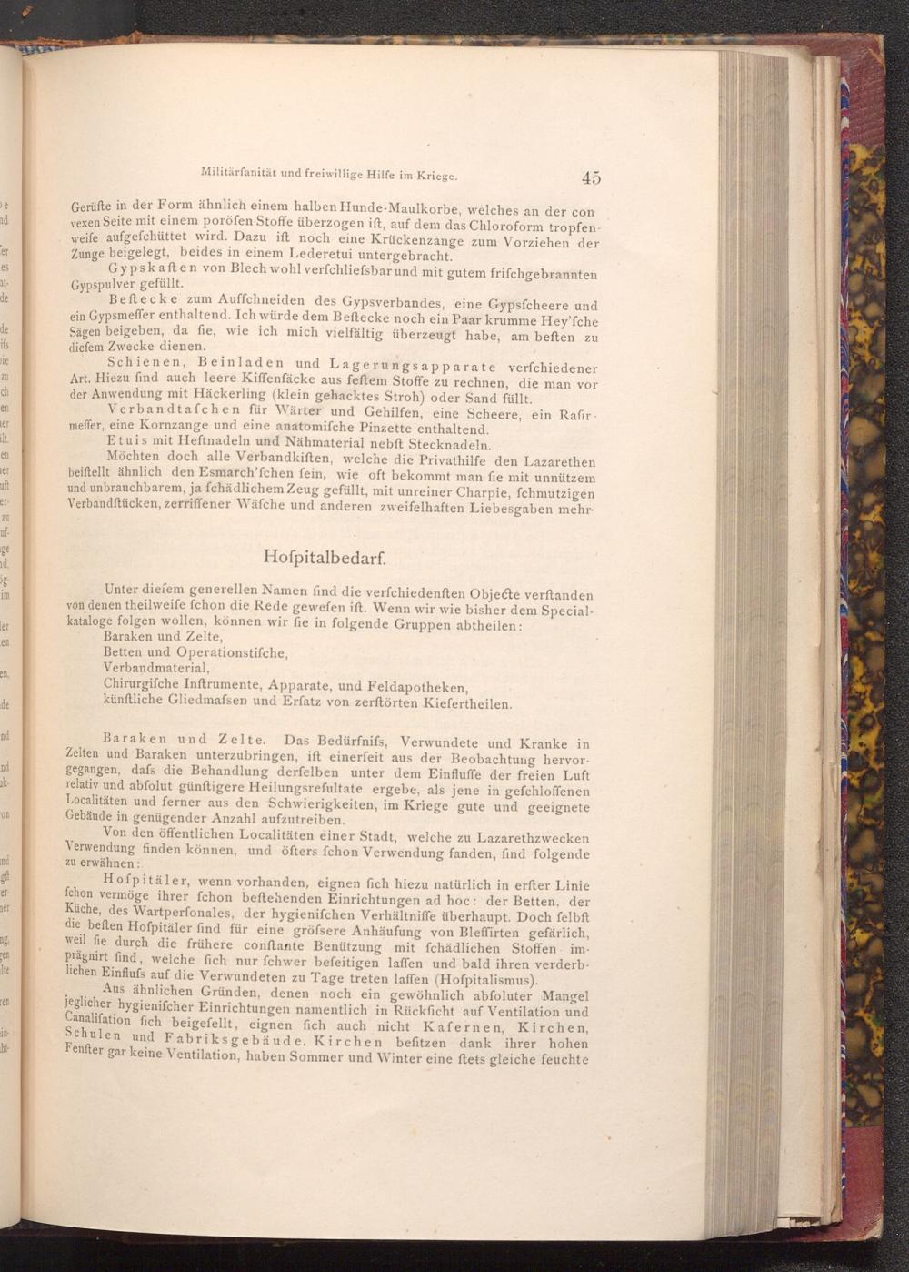 Hofpitäler, wenn vorhanden, eignen fich hiezu natürlich in erster Linie fchon vermöge ihrer fchon beftehenden Einrichtungen ad hoc: der Betten, der Küche, des Wartperfonales, der hygienifchen Verhältniffe überhaupt. Doch felbft die beften Hofpitäler find für eine gröfsere Anhäufung von Bleffirten gefärlich, weil fie durch die frühere conftante Benützung mit fchädlichen Stoffen imprägnirt find, welche fich nur fchwer befeitigen laffen und bald ihren verderblichen Einfluss auf die Verwundeten zu Tage treten laffen( Hofpitalismus).