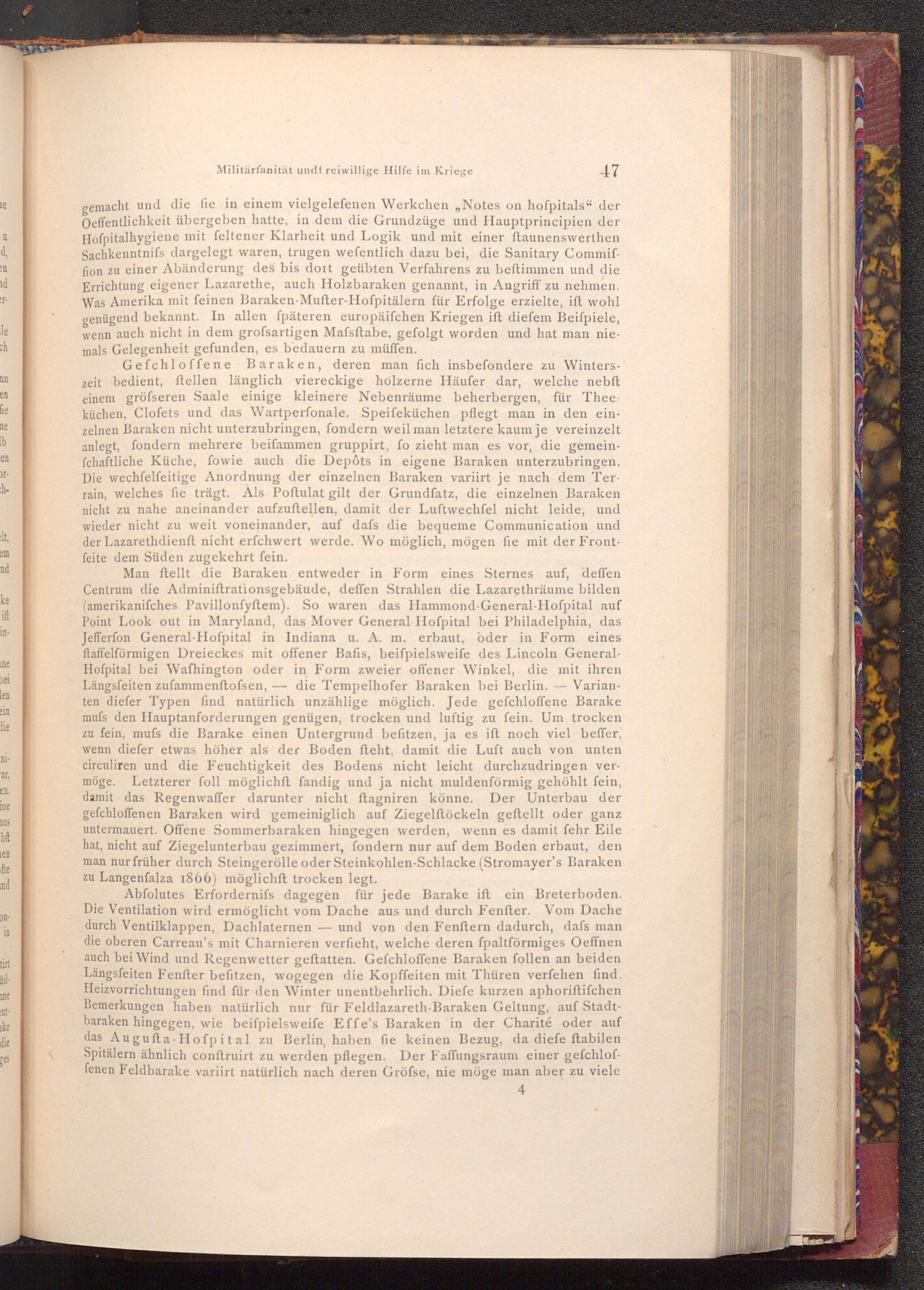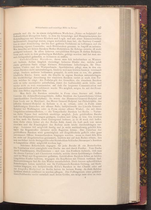 gemacht und die fie in einem vielgelefenen Werkchen ,, Notes on hofpitals" der Oeffentlichkeit übergeben hatte, in dem die Grundzüge und Hauptprincipien der Hofpitalhygiene mit feltener Klarheit und Logik und mit einer ftaunenswerthen Sachkenntnifs dargelegt waren, trugen wefentlich dazu bei, die Sanitary Commiffion zu einer Abänderung des bis dort geübten Verfahrens zu beftimmen und die Errichtung eigener Lazarethe, auch Holzbaraken genannt, in Angriff zu nehmen. Was Amerika mit feinen Baraken- Mufter- Hofpitälern für Erfolge erzielte, ift wohl genügend bekannt. In allen fpäteren europäiſchen Kriegen ift diefem Beiſpiele, wenn auch nicht in dem grofsartigen Mafsftabe, gefolgt worden und hat man niemals Gelegenheit gefunden, es bedauern zu müffen.