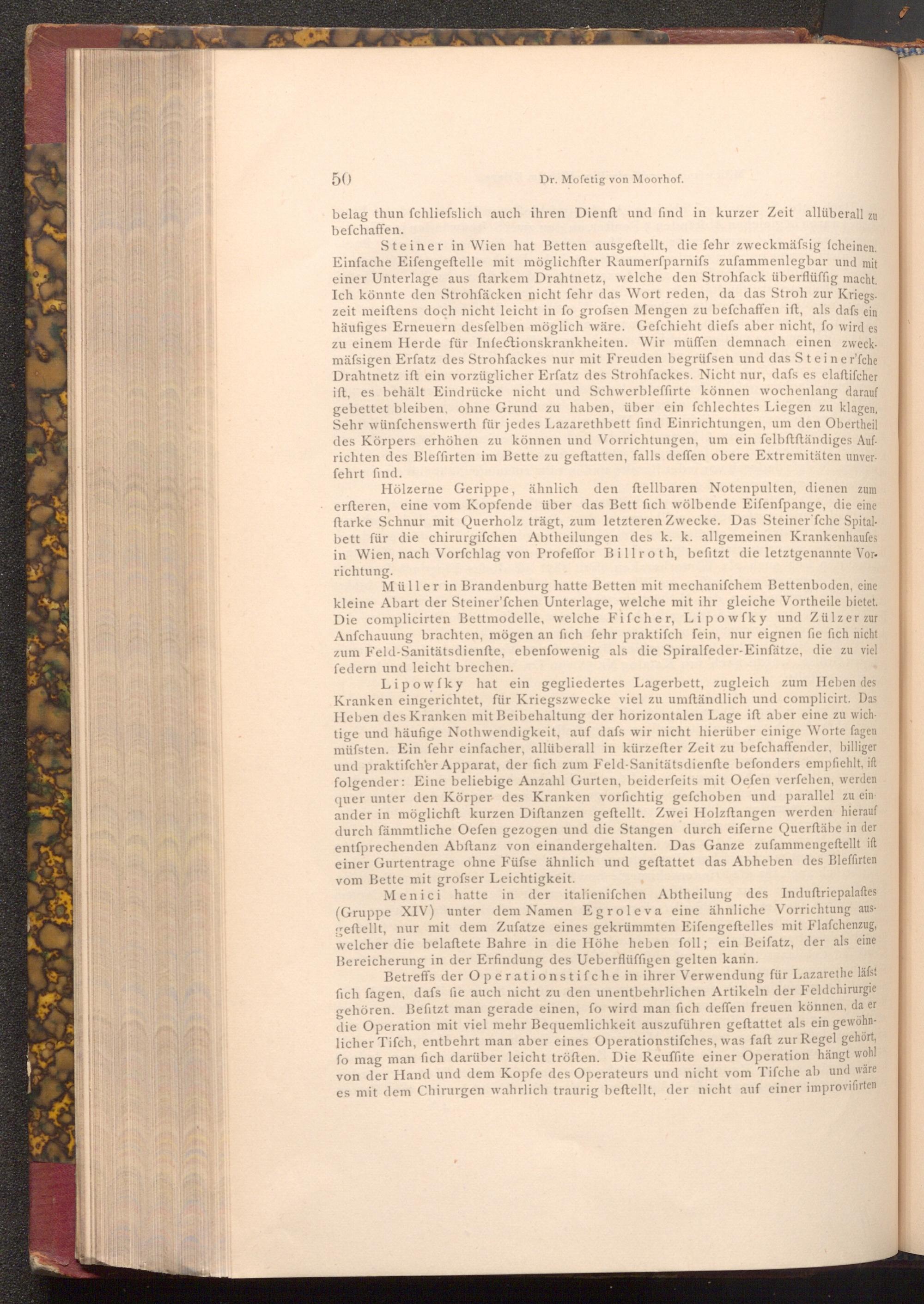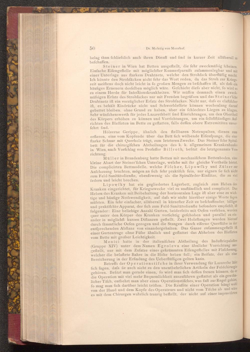 Steiner in Wien hat Betten ausgeftellt, die fehr zweckmässig fcheinen. Einfache Eifengeftelle mit möglichfter Raumerfparnifs zufammenlegbar und mit einer Unterlage aus ftarkem Drahtnetz, welche den Strohfack überflüffig macht. Ich könnte den Strohfäcken nicht fehr das Wort reden, da das Stroh zur Kriegszeit meiftens doch nicht leicht in fo grofsen Mengen zu befchaffen ift, als dafs ein häufiges Erneuern desfelben möglich wäre. Gefchieht diefs aber nicht, fo wird es zu einem Herde für Infectionskrankheiten. Wir müffen demnach einen zweckmässigen Erfatz des Strohfackes nur mit Freuden begrüfsen und das Steiner'fche Drahtnetz ift ein vorzüglicher Erfatz des Strohfackes. Nicht nur, dafs es elaftifcher ift, es behält Eindrücke nicht und Schwerbleffirte können wochenlang darauf gebettet bleiben, ohne Grund zu haben, über ein fchlechtes Liegen zu klagen, Sehr wünſchenswerth für jedes Lazarethbett find Einrichtungen, um den Obertheil des Körpers erhöhen zu können und Vorrichtungen, um ein felbftftändiges Aufrichten des Bleffirten im Bette zu geftatten, falls deffen obere Extremitäten unverfehrt find.
