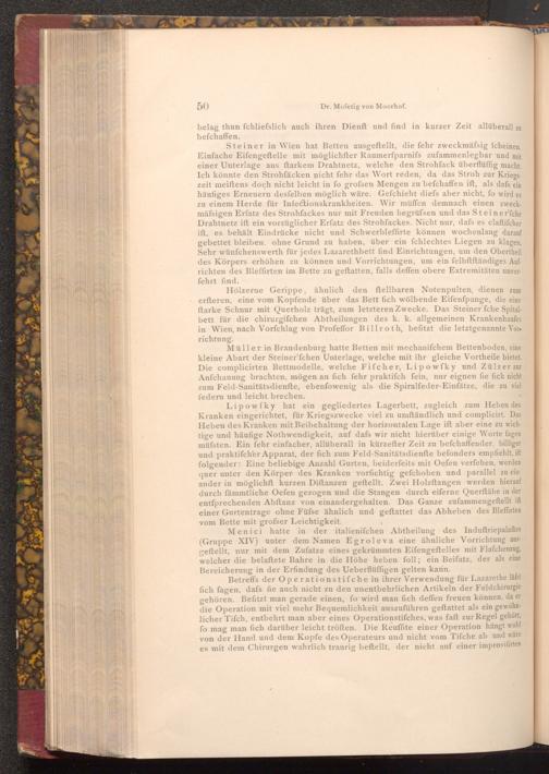 Müller in Brandenburg hatte Betten mit mechanifchem Bettenboden, eine kleine Abart der Steiner'fchen Unterlage, welche mit ihr gleiche Vortheile bietet. Die complicirten Bettmodelle, welche Fifcher, Lipowfky und Zülzer zur Anfchauung brachten, mögen an fich fehr praktiſch fein, nur eignen fie fich nicht zum Feld- Sanitätsdienfte, ebenfowenig als die Spiralfeder- Einfätze, die zu viel federn und leicht brechen.