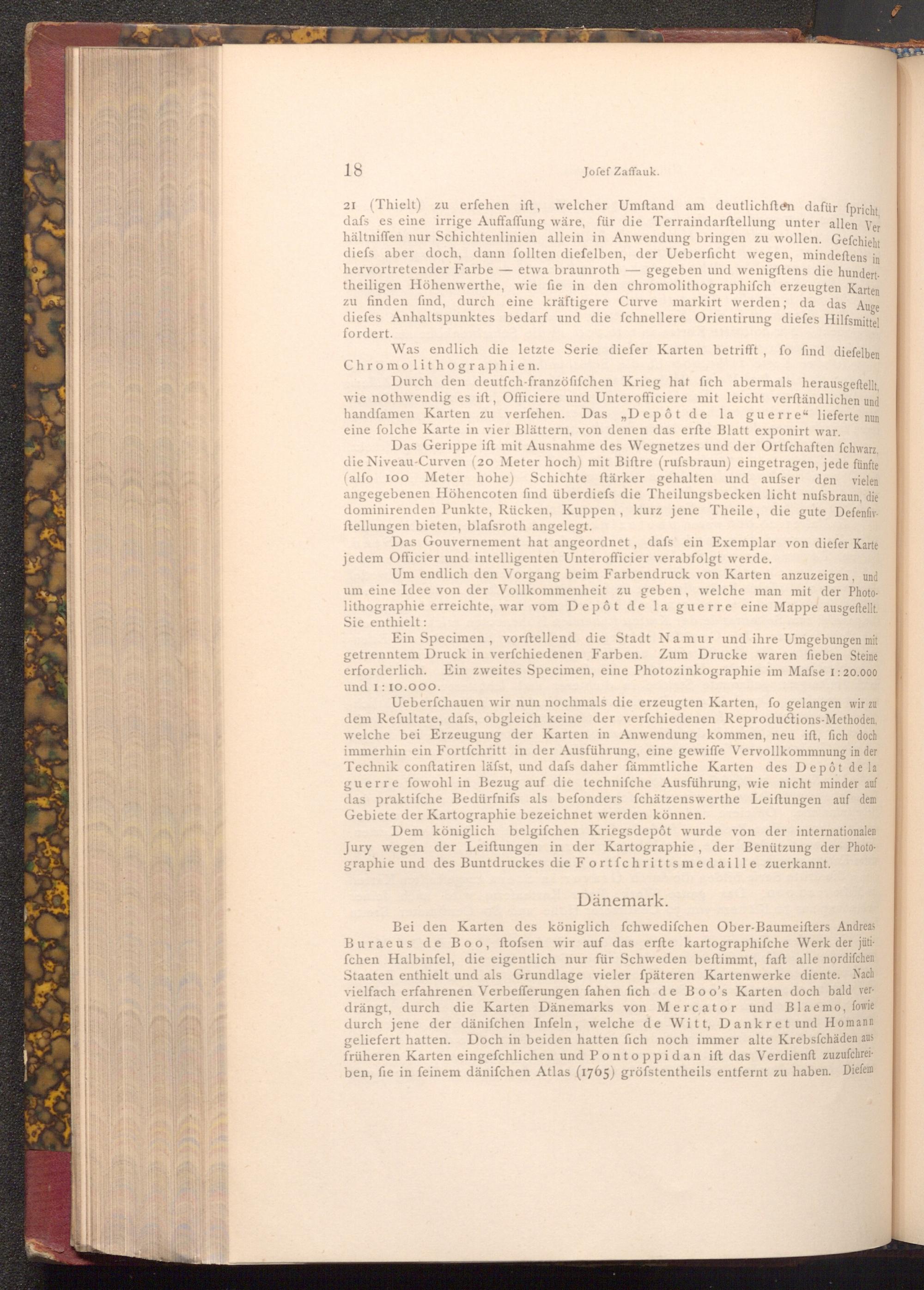 Bei den Karten des königlich fchwedifchen Ober- Baumeifters Andreas Buraeus de Boo, ftofsen wir auf das erfte kartographifche Werk der jütifchen Halbinfel, die eigentlich nur für Schweden beftimmt, faft alle nordifchen Staaten enthielt und als Grundlage vieler fpäteren Kartenwerke diente. Nach vielfach erfahrenen Verbefferungen fahen fich de Boo's Karten doch bald verdrängt, durch die Karten Dänemarks von Mercator und Blaemo, fowie durch jene der dänifchen Infeln, welche de Witt, Dankret und Homann geliefert hatten. Doch in beiden hatten fich noch immer alte Krebsfchäden aus früheren Karten eingefchlichen und Pontoppidan ift das Verdienft zuzufchrei ben, fie in feinem dänifchen Atlas( 1765) gröfstentheils entfernt zu haben. Diefem