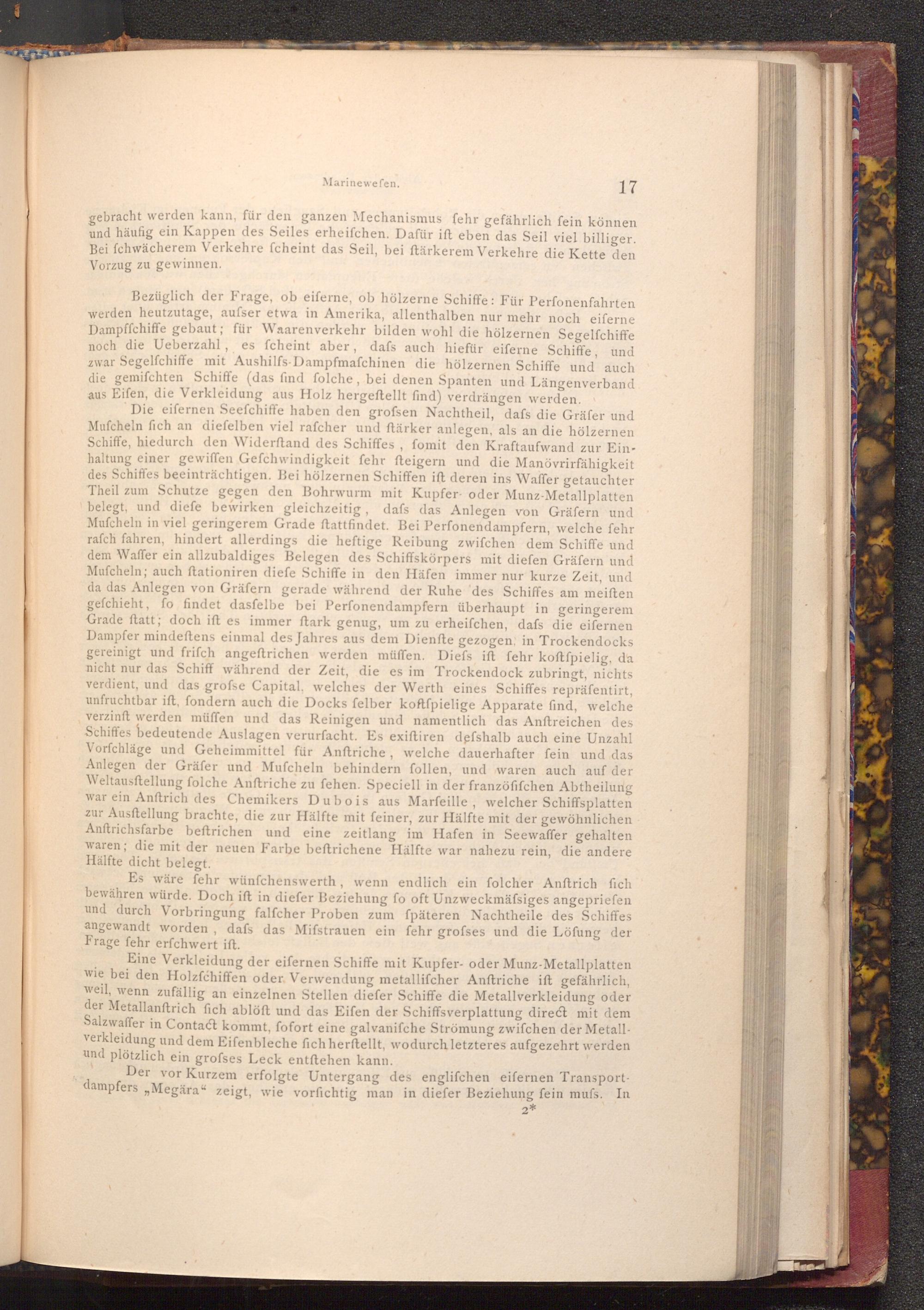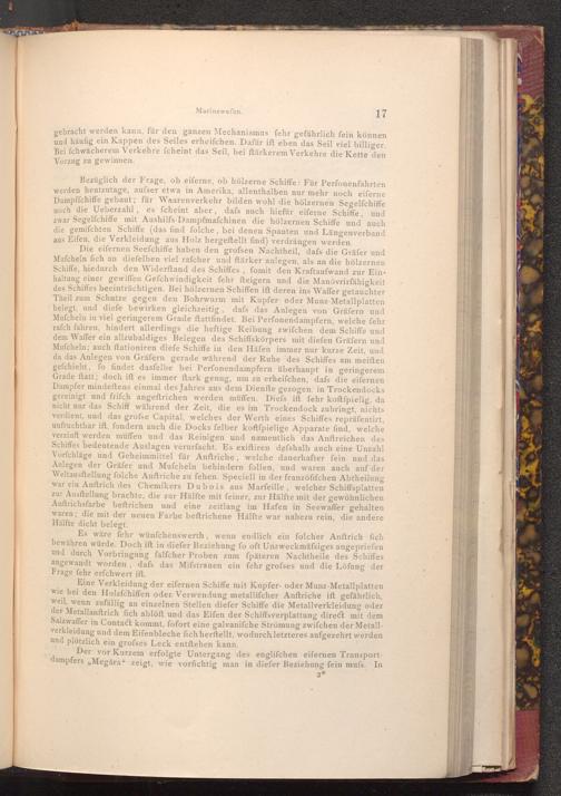 Die eifernen Seefchiffe haben den grofsen Nachtheil, dafs die Gräfer und Mufcheln fich an diefelben viel rafcher und ftärker anlegen, als an die hölzernen Schiffe, hiedurch den Widerftand des Schiffes, fomit den Kraftaufwand zur Einhaltung einer gewiffen Gefchwindigkeit fehr fteigern und die Manövrirfähigkeit des Schiffes beeinträchtigen. Bei hölzernen Schiffen ift deren ins Waffer getauchter Theil zum Schutze gegen den Bohrwurm mit Kupfer oder Munz- Metallplatten belegt, und diefe bewirken gleichzeitig, dafs das Anlegen von Gräfern und Mufcheln in viel geringerem Grade ftattfindet. Bei Perfonendampfern, welche fehr rafch fahren, hindert allerdings die heftige Reibung zwifchen dem Schiffe und dem Waffer ein allzubaldiges Belegen des Schiffskörpers mit diefen Gräfern und Mufcheln; auch ftationiren diefe Schiffe in den Häfen immer nur kurze Zeit, und da das Anlegen von Gräfern gerade während der Ruhe des Schiffes am meiften gefchieht, fo findet dasfelbe bei Perfonendampfern überhaupt in geringerem Grade ftatt; doch ift es immer ftark genug, um zu erheifchen, dafs die eifernen Dampfer mindeftens einmal des Jahres aus dem Dienfte gezogen, in Trockendocks gereinigt und frifch angeftrichen werden müffen. Diefs ift fehr koftfpielig, da nicht nur das Schiff während der Zeit, die es im Trockendock zubringt, nichts verdient, und das grofse Capital, welches der Werth eines Schiffes repräfentirt, unfruchtbar ift, fondern auch die Docks felber koftfpielige Apparate find, welche verzinft werden müffen und das Reinigen und namentlich das Anftreichen des Schiffes bedeutende Auslagen verurfacht. Es exiftiren defshalb auch eine Unzahl Vorfchläge und Geheimmittel für Anftriche, welche dauerhafter fein und das Anlegen der Gräfer und Mufcheln behindern follen, und waren auch auf der Weltausftellung folche Anftriche zu fehen. Speciell in der franzöfifchen Abtheilung war ein Anftrich des Chemikers Dubois aus Marfeille, welcher Schiffsplatten zur Ausftellung brachte, die zur Hälfte mit feiner, zur Hälfte mit der gewöhnlichen Anftrichsfarbe beftrichen und eine zeitlang im Hafen in Seewaffer gehalten waren; die mit der neuen Farbe beftrichene Hälfte war nahezu rein, die andere Hälfte dicht belegt.