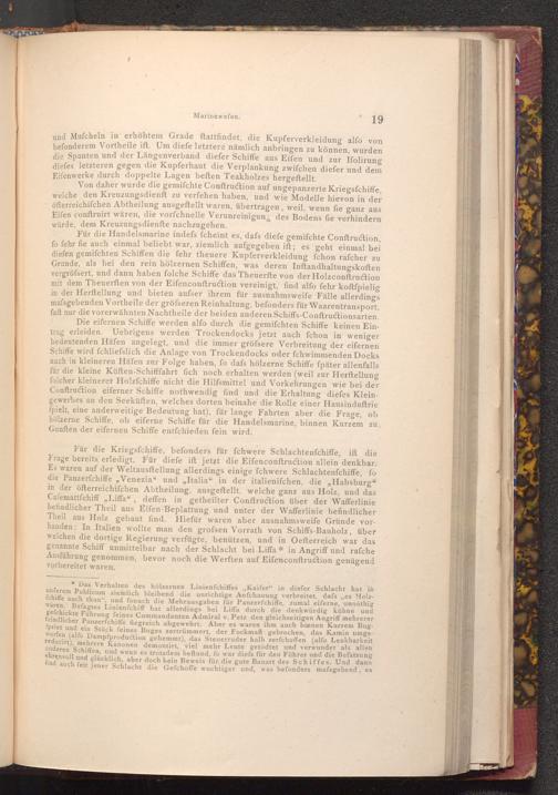 Von daher wurde die gemifchte Conftruction auf ungepanzerte Kriegsfchiffe, welche den Kreuzungsdienft zu verfehen haben, und wie Modelle hievon in der öfterreichifchen Abtheilung ausgeftellt waren, übertragen, weil, wenn fie ganz aus Eifen conftruirt wären, die vorfchnelle Verunreinigung des Bodens fie verhindern würde, dem Kreuzungsdienfte nachzugehen.