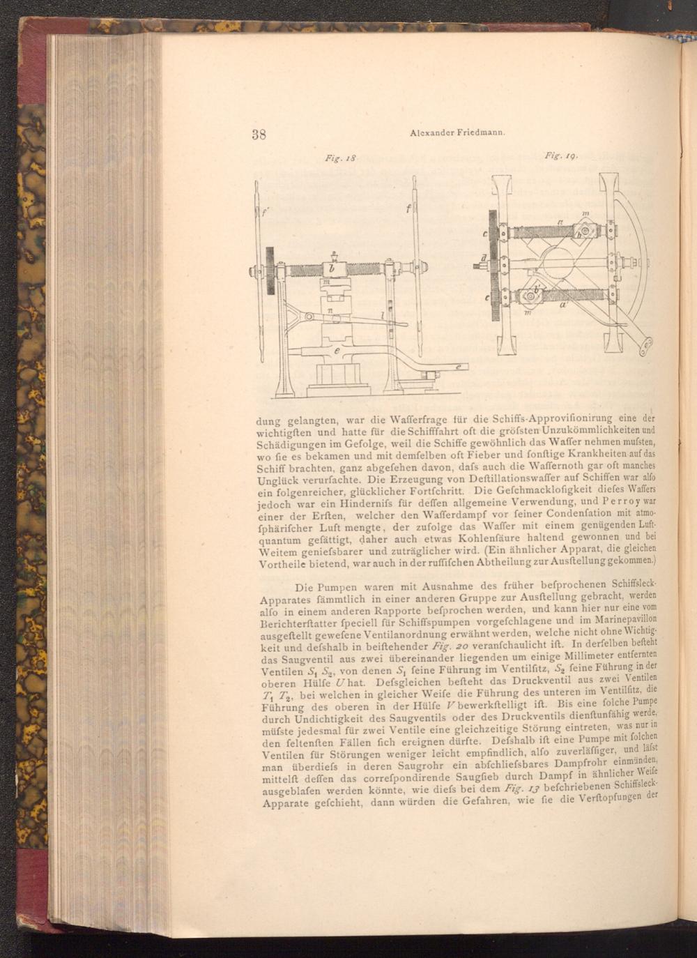 dung gelangten, war die Wafferfrage für die Schiffs- Approvifionirung eine der wichtigften und hatte für die Schifffahrt oft die gröfsten Unzukömmlichkeiten und Schädigungen im Gefolge, weil die Schiffe gewöhnlich das Waffer nehmen mufsten, wo fie es bekamen und mit demfelben oft Fieber und fonftige Krankheiten auf das Schiff brachten, ganz abgefehen davon, dafs auch die Waffernoth gar oft manches Unglück verurfachte. Die Erzeugung von Deftillationswaffer auf Schiffen war alfo ein folgenreicher, glücklicher Fortfchritt. Die Gefchmacklofigkeit diefes Waffers jedoch war ein Hindernifs für deffen allgemeine Verwendung, und Perro y war einer der Erften, welcher den Wafferdampf vor feiner Condenſation mit atmofphärifcher Luft mengte, der zufolge das Waffer mit einem genügenden Luftquantum gefättigt, daher auch etwas Kohlenfäure haltend gewonnen und bei Weitem geniefsbarer und zuträglicher wird.( Ein ähnlicher Apparat, die gleichen Vortheile bietend, war auch in der ruffifchen Abtheilung zur Ausftellung gekommen.)