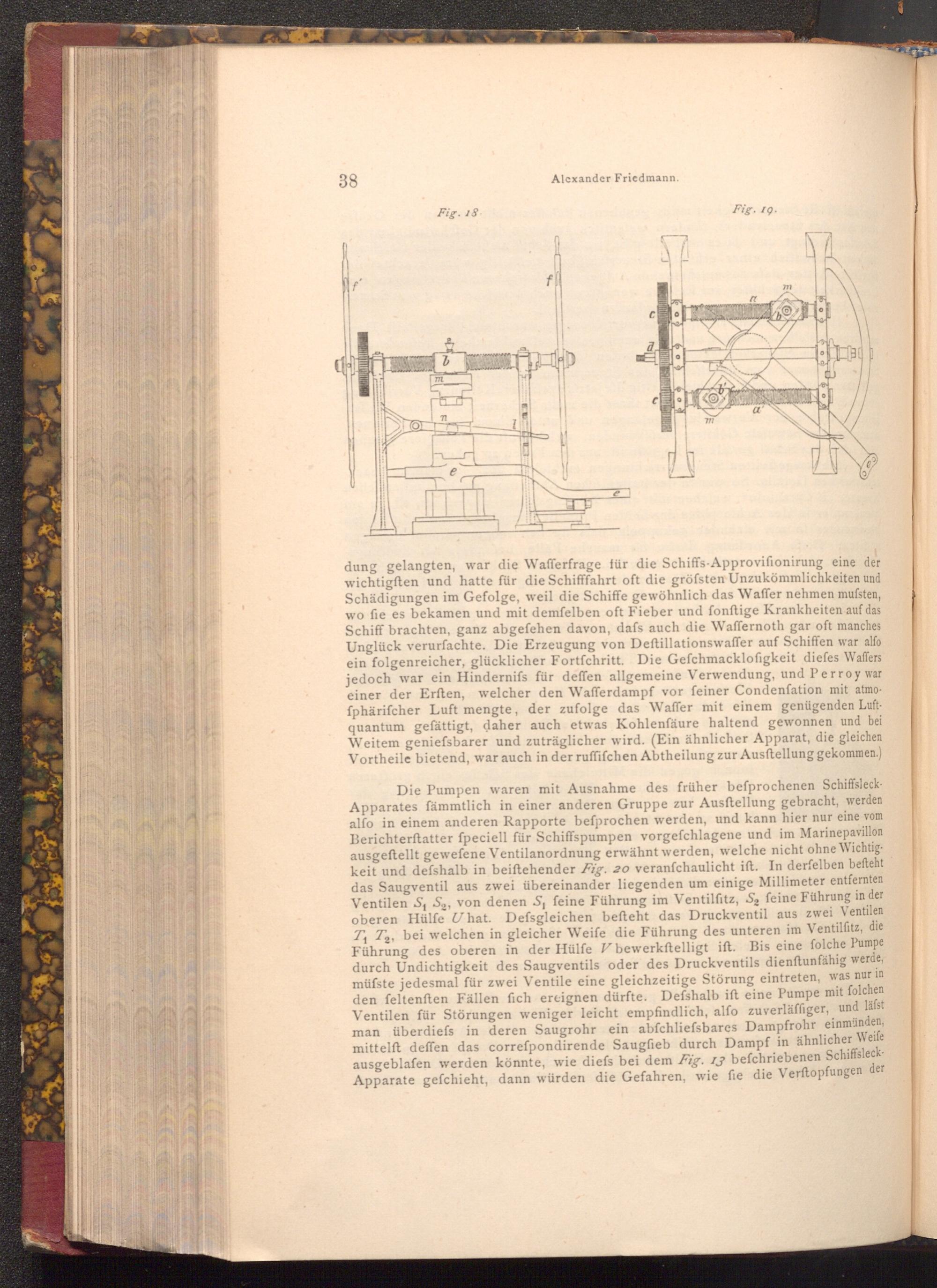 Die Pumpen waren mit Ausnahme des früher befprochenen SchiffsleckApparates fämmtlich in einer anderen Gruppe zur Ausftellung gebracht, werden alfo in einem anderen Rapporte befprochen werden, und kann hier nur eine vom Berichterstatter fpeciell für Schiffspumpen vorgefchlagene und im Marinepavillon ausgeftellt gewefene Ventilanordnung erwähnt werden, welche nicht ohne Wichtig keit und defshalb in beiftehender Fig. 20 veranfchaulicht ift. In derfelben befteht das Saugventil aus zwei übereinander liegenden um einige Millimeter entfernten Ventilen S₁ S₂, von denen S, feine Führung im Ventilfitz, S₂ feine Führung in der oberen Hülfe U hat. Defsgleichen befteht das Druckventil aus zwei Ventilen T₁ T₂, bei welchen in gleicher Weife die Führung des unteren im Ventilfitz, die Führung des oberen in der Hülfe V bewerkstelligt ift. Bis eine folche Pumpe durch Undichtigkeit des Saugventils oder des Druckventils dienftunfähig werde, müfste jedesmal für zwei Ventile eine gleichzeitige Störung eintreten, was nur in den feltenften Fällen fich ereignen dürfte. Defshalb ift eine Pumpe mit folchen Ventilen für Störungen weniger leicht empfindlich, alfo zuverläffiger, und läfst man überdiefs in deren Saugrohr ein abfchliefs bares Dampfrohr einmünden, mittelft deffen das correfpondirende Saugfieb durch Dampf in ähnlicher Weife ausgeblafen werden könnte, wie diefs bei dem Fig. 13 befchriebenen SchiffsleckApparate gefchieht, dann würden die Gefahren, wie fie die Verftopfungen der