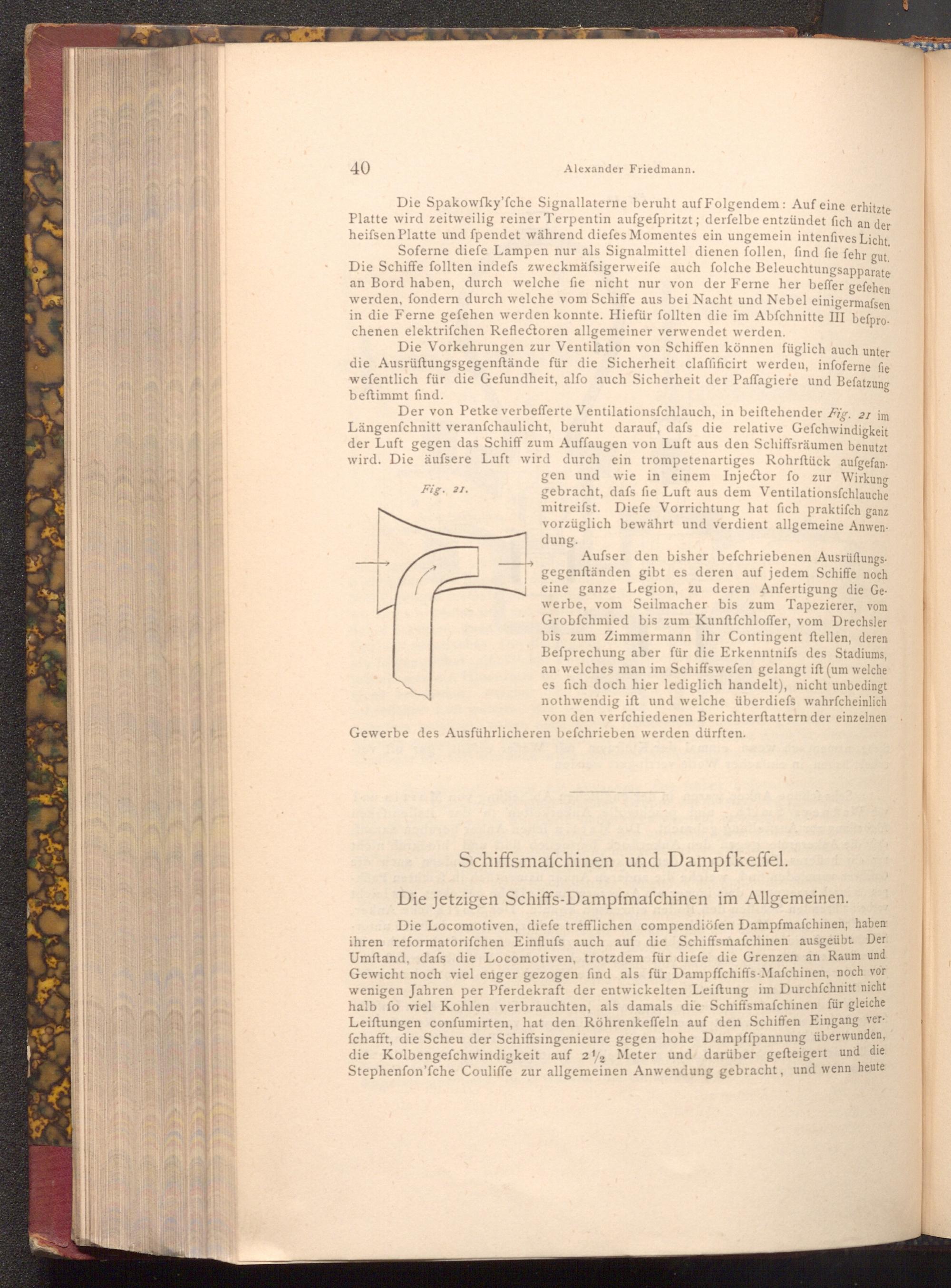 Der von Petke verbefferte Ventilationsfchlauch, in beiftehender Fig. 21 im Längenfchnitt veranfchaulicht, beruht darauf, dafs die relative Gefchwindigkeit der Luft gegen das Schiff zum Auffaugen von Luft aus den Schiffsräumen benutzt wird. Die äufsere Luft wird durch ein trompetenartiges Rohrftück aufgefangen und wie in einem Injector fo zur Wirkung gebracht, dafs fie Luft aus dem Ventilationsfchlauche mitreifst. Diefe Vorrichtung hat fich praktisch ganz vorzüglich bewährt und verdient allgemeine Anwendung.
