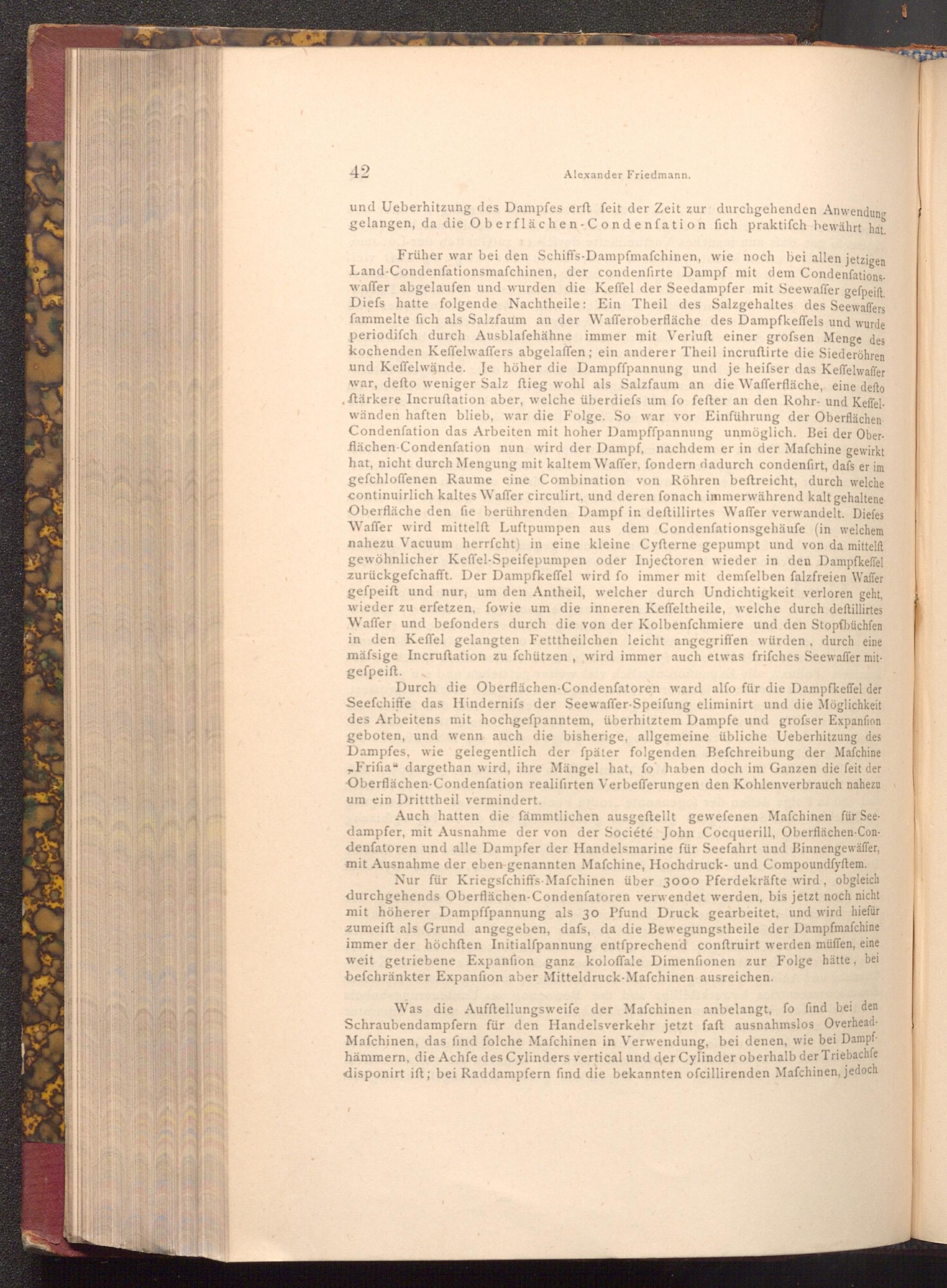 Durch die Oberflächen- Condenfatoren ward alfo für die Dampfkeffel der Seefchiffe das Hindernifs der Seewaffer- Speifung eliminirt und die Möglichkeit des Arbeitens mit hochgefpanntem, überhitztem Dampfe und grofser Expanfion geboten, und wenn auch die bisherige, allgemeine übliche Ueberhitzung des Dampfes, wie gelegentlich der fpäter folgenden Befchreibung der Mafchine Frifia" dargethan wird, ihre Mängel hat, fo haben doch im Ganzen die feit der Oberflächen- Condenſation realifirten Verbefferungen den Kohlenverbrauch nahezu um ein Dritttheil vermindert.