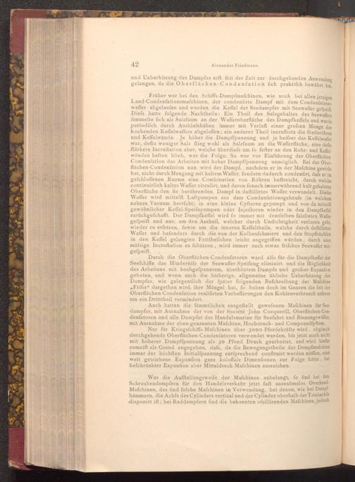 und Ueberhitzung des Dampfes erft feit der Zeit zur durchgehenden Anwendung gelangen, da die Oberflächen- Condenfation fich praktiſch bewährt hat.