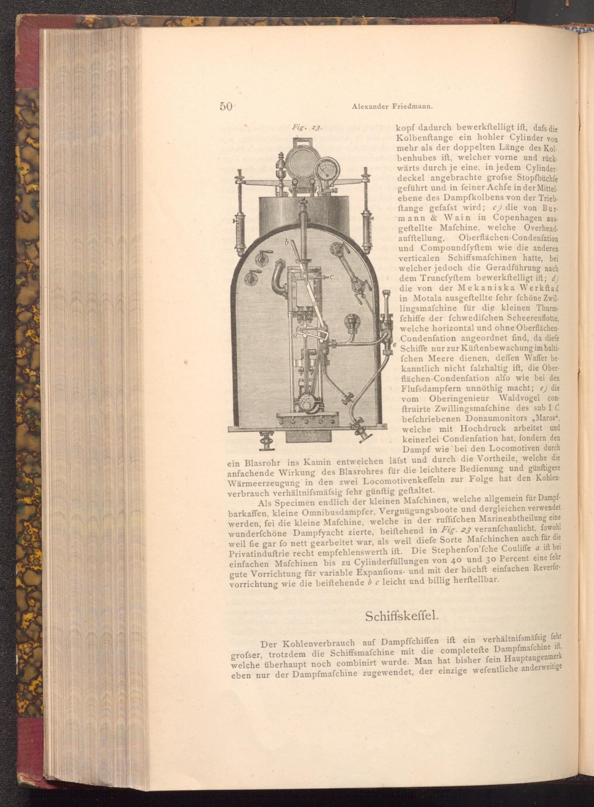 Als Specimen endlich der kleinen Mafchinen, welche allgemein für Dampfbarkaffen, kleine Omnibusdampfer, Vergnügungsboote und dergleichen verwendet werden, fei die kleine Mafchine, welche in der ruffifchen Marineabtheilung eine wunderfchöne Dampfyacht zierte, beiftehend in Fig. 23 veranfchaulicht, fowohl weil fie gar fo nett gearbeitet war, als weil diefe Sorte Mafchinchen auch für die Privatinduftrie recht empfehlenswerth ift. Die Stephenfon'fche Couliffe a ift bei einfachen Mafchinen bis zu Cylinderfüllungen von 40 und 30 Percent eine fehr gute Vorrichtung für variable Expanfions- und mit der höchft einfachen Reverfirvorrichtung wie die beiftehende b c leicht und billig herftellbar.