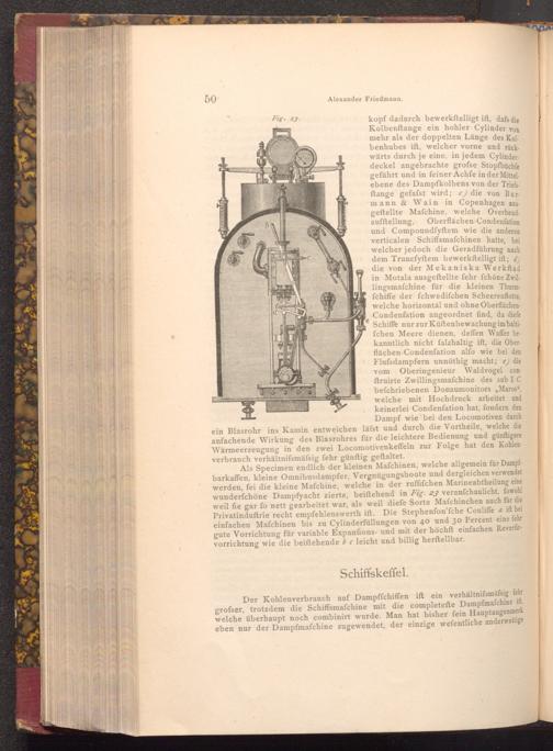 Der Kohlenverbrauch auf Dampffchiffen ift ein verhältnifsmäfsig fehr grofser, trotzdem die Schiffsmafchine mit die completefte Dampfmaschine ift, welche überhaupt noch combinirt wurde. Man hat bisher fein Hauptaugenmerk eben nur der Dampfmafchine zugewendet, der einzige wefentliche anderweitige