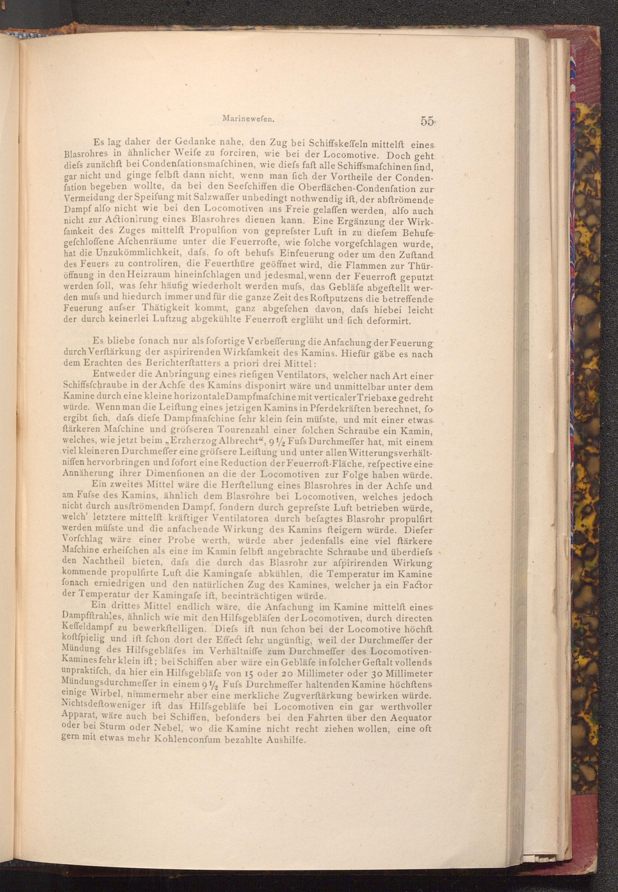 Ein drittes Mittel endlich wäre, die Anfachung im Kamine mittelft eines Dampfftrahles, ähnlich wie mit den Hilfsgebläfen der Locomotiven, durch directen Keffeldampf zu bewerkstelligen. Diefs ift nun fchon bei der Locomotive höchft. koftfpielig und ift fchon dort der Effect fehr ungünftig, weil der Durchmeffer der Mündung des Hilfsgebläfes im Verhältniffe zum Durchmeffer des LocomotivenKamines fehr klein ift; bei Schiffen aber wäre ein Gebläfe in folcher Geftalt vollends unpraktiſch, da hier ein Hilfsgebläfe von 15 oder 20 Millimeter oder 30 Millimeter Mündungsdurchmeffer in einem 9%, Fufs Durchmeffer haltenden Kamine höchftens einige Wirbel, nimmermehr aber eine merkliche Zugverftärkung bewirken würde. Nichtsdeftoweniger ift das Hilfsgebläfe bei Locomotiven ein gar werthvoller Apparat, wäre auch bei Schiffen, befonders bei den Fahrten über den Aequator oder bei Sturm oder Nebel, wo die Kamine nicht recht ziehen wollen, eine oft gern mit etwas mehr Kohlenconfum bezahlte Aushilfe.