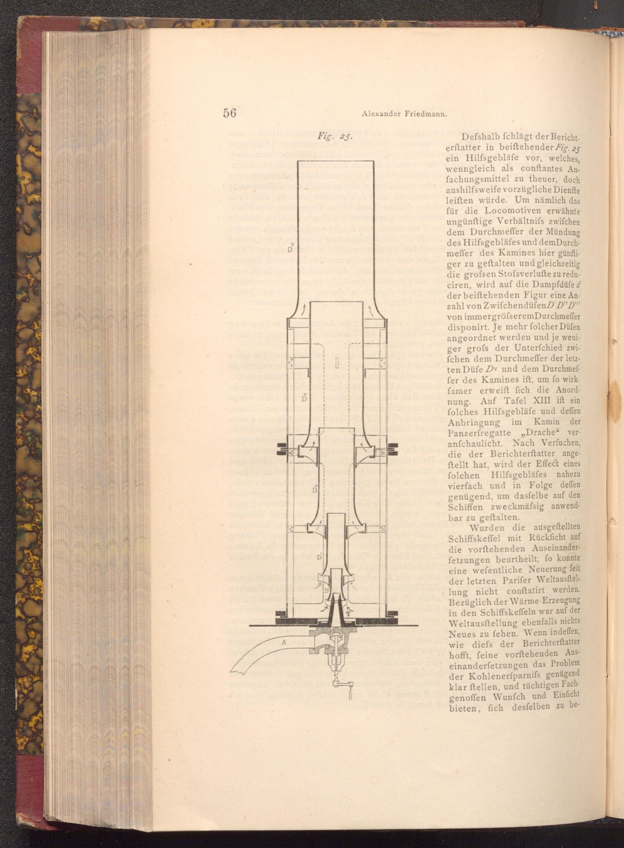 Defshalb fchlägt der Berichterftatter in beiftehender Fig. 25 ein Hilfsgebläfe vor, welches, wenngleich als conftantes Anfachungsmittel zu theuer, doch aushilfsweife vorzügliche Dienſte leiften würde. Um nämlich das für die Locomotiven erwähnte ungünftige Verhältnifs zwifchen dem Durchmeffer der Mündung des Hilfsgebläfes und demDurchmeffer des Kamines hier günftiger zu geftalten und gleichzeitig die grofsen Stofsverlufte zu reduciren, wird auf die Dampfdüfe d der beiftehenden Figur eine Anzahl von ZwifchendüfenD'D'D' von immergröfserem Durchmeffer disponirt. Je mehr folcher Düfen angeordnet werden und je weniger grofs der Unterfchied zwifchen dem Durchmeffer der letzten Düfe Dv und dem Durchmef fer des Kamines ift, um fo wirkfamer erweift fich die Anordnung. Auf Tafel XIII ift ein folches Hilfsgebläfe und deffen Anbringung im Kamin der Panzerfregatte„ Drache" ver. anfchaulicht. Nach Verfuchen, die der Berichterftatter angeftellt hat, wird der Effect eines folchen Hilfsgebläfes nahezu vierfach und in Folge deffen genügend, um dasfelbe auf den Schiffen zweckmäfsig anwendbar zu geftalten.