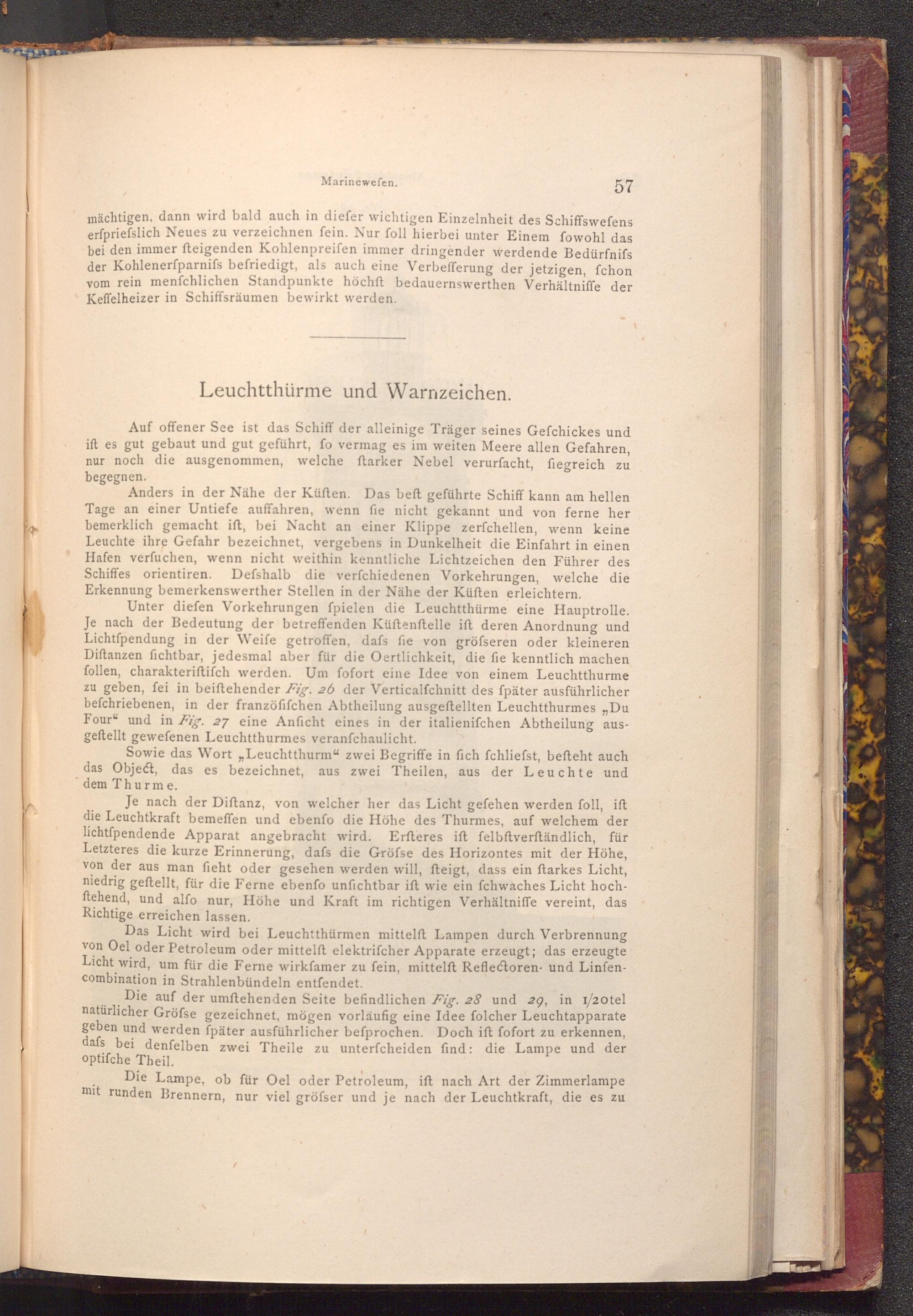 Unter diefen Vorkehrungen fpielen die Leuchtthürme eine Hauptrolle. Je nach der Bedeutung der betreffenden Küftenftelle ift deren Anordnung und Lichtfpendung in der Weife getroffen, dafs fie von gröfseren oder kleineren Diftanzen fichtbar, jedesmal aber für die Oertlichkeit, die fie kenntlich machen follen, charakteriftifch werden. Um fofort eine Idee von einem Leuchtthurme zu geben, fei in beiftehender Fig. 26 der Verticalfchnitt des fpäter ausführlicher befchriebenen, in der franzöfifchen Abtheilung ausgeftellten Leuchtthurmes„ Du Four" und in Fig. 27 eine Anficht eines in der italienifchen Abtheilung ausgeftellt gewefenen Leuchtthurmes veranfchaulicht.