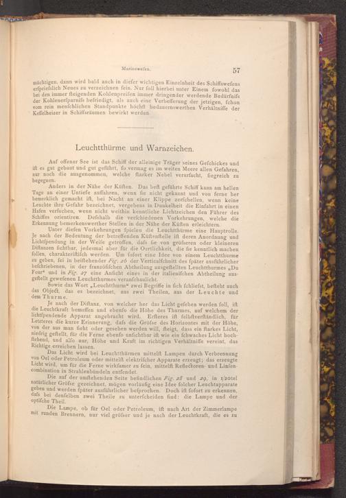 Anders in der Nähe der Küften. Das beft geführte Schiff kann am hellen Tage an einer Untiefe auffahren, wenn fie nicht gekannt und von ferne her bemerklich gemacht ift, bei Nacht an einer Klippe zerfchellen, wenn keine Leuchte ihre Gefahr bezeichnet, vergebens in Dunkelheit die Einfahrt in einen Hafen verfuchen, wenn nicht weithin kenntliche Lichtzeichen den Führer des Schiffes orientiren. Defshalb die verfchiedenen Vorkehrungen, welche die Erkennung bemerkenswerther Stellen in der Nähe der Küften erleichtern.