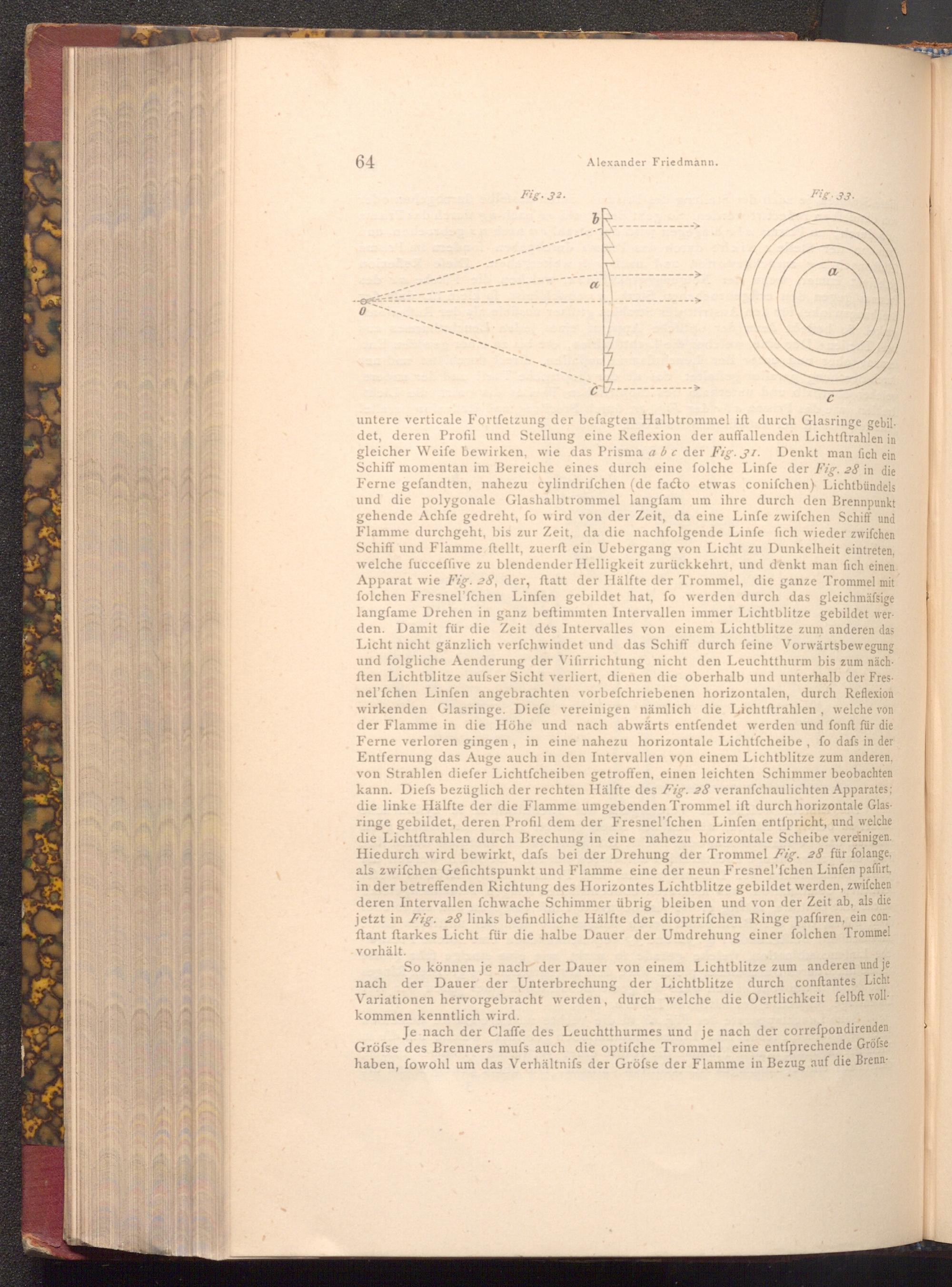 untere verticale Fortfetzung der befagten Halbtrommel ift durch Glasringe gebildet, deren Profil und Stellung eine Reflexion der auffallenden Lichtftrahlen in gleicher Weife bewirken, wie das Prisma a b c der Fig. 31. Denkt man fich ein Schiff momentan im Bereiche eines durch eine folche Linfe der Fig. 28 in die Ferne gefandten, nahezu cylindrifchen( de facto etwas conifchen) Lichtbündels und die polygonale Glashalbtrommel langfam um ihre durch den Brennpunkt gehende Achfe gedreht, fo wird von der Zeit, da eine Linfe zwifchen Schiff und Flamme durchgeht, bis zur Zeit, da die nachfolgende Linfe fich wieder zwifchen Schiff und Flamme ftellt, zuerft ein Uebergang von Licht zu Dunkelheit eintreten, welche fucceffive zu blendender Helligkeit zurückkehrt, und denkt man fich einen Apparat wie Fig. 28, der, ftatt der Hälfte der Trommel, die ganze Trommel mit folchen Fresnel'fchen Linfen gebildet hat, fo werden durch das gleichmässige langfame Drehen in ganz beftimmten Intervallen immer Lichtblitze gebildet wer den. Damit für die Zeit dés Intervalles von einem Lichtblitze zum anderen das Licht nicht gänzlich verfchwindet und das Schiff durch feine Vorwärtsbewegung und folgliche Aenderung der Vifirrichtung nicht den Leuchtthurm bis zum näch ften Lichtblitze aufser Sicht verliert, dienen die oberhalb und unterhalb der Fresnel'fchen Linfen angebrachten vorbefchriebenen horizontalen, durch Reflexion wirkenden Glasringe. Diefe vereinigen nämlich die Lichtftrahlen, welche von der Flamme in die Höhe und nach abwärts entfendet werden und fonft für die Ferne verloren gingen, in eine nahezu horizontale Lichtfcheibe, fo dafs in der Entfernung das Auge auch in den Intervallen von einem Lichtblitze zum anderen, von Strahlen diefer Lichtfcheiben getroffen, einen leichten Schimmer beobachten kann. Diefs bezüglich der rechten Hälfte des Fig. 28 veranfchaulichten Apparates; die linke Hälfte der die Flamme umgebenden Trommel ift durch horizontale Glasringe gebildet, deren Profil dem der Fresnel'fchen Linfen entspricht, und welche die Lichtftrahlen durch Brechung in eine nahezu horizontale Scheibe vereinigen. Hiedurch wird bewirkt, dafs bei der Drehung der Trommel Fig. 28 für folange, als zwifchen Gefichtspunkt und Flamme eine der neun Fresnel'fchen Linfen paffirt, in der betreffenden Richtung des Horizontes Lichtblitze gebildet werden, zwifchen deren Intervallen fchwache Schimmer übrig bleiben und von der Zeit ab, als die jetzt in Fig. 28 links befindliche Hälfte der dioptrifchen Ringe paffiren, ein conftant ftarkes Licht für die halbe Dauer der Umdrehung einer folchen Trommel